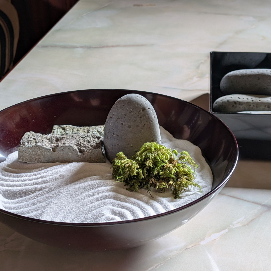 越前塗の器に白砂や福井特産の笏谷石、苔を用いて、参加者自身の手で枯山水の箱庭を制作。漆器工房「漆器久太郎」の曽明富代氏が直接指導します。完成した作品はお持ち帰りいただけます。