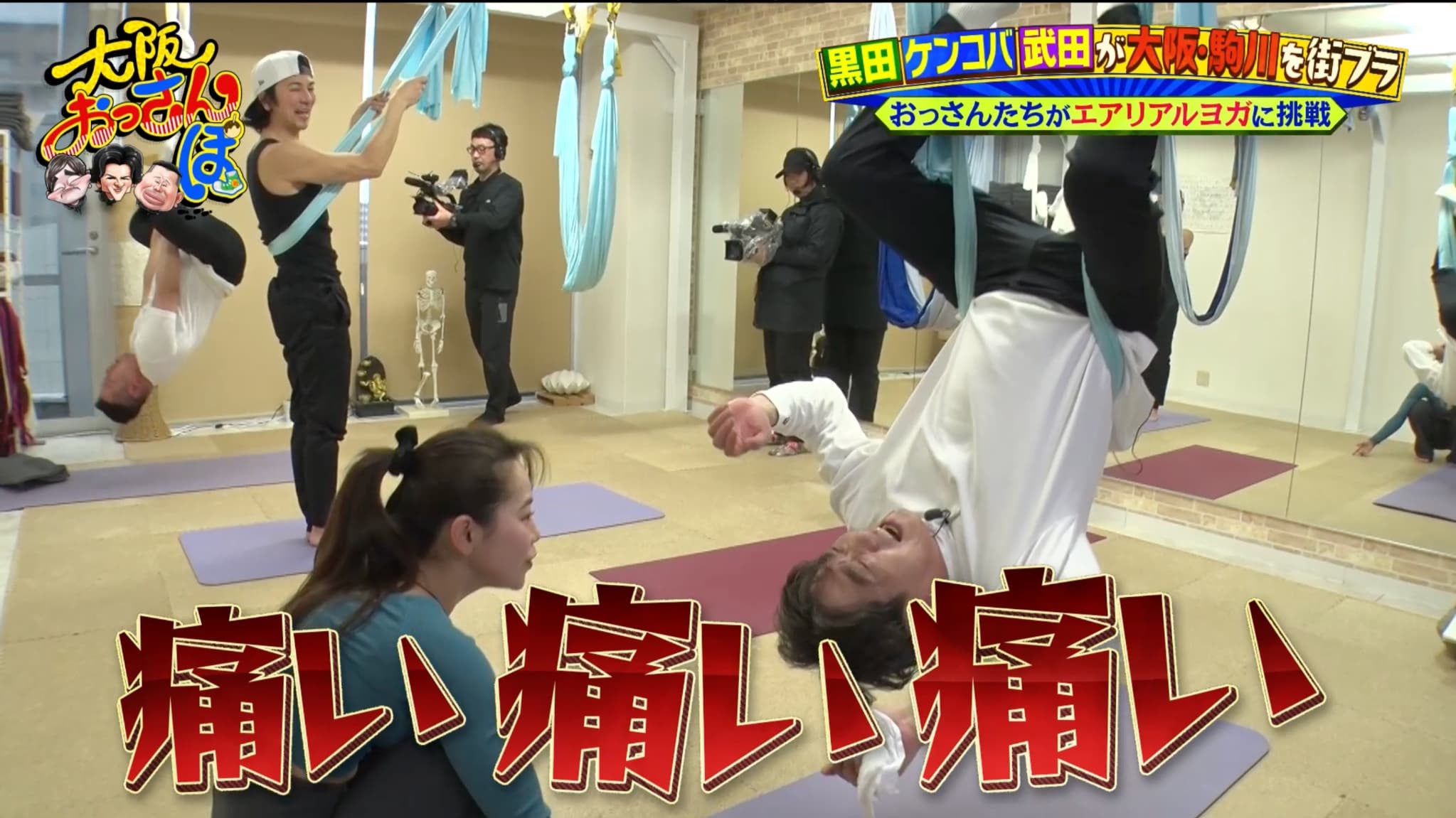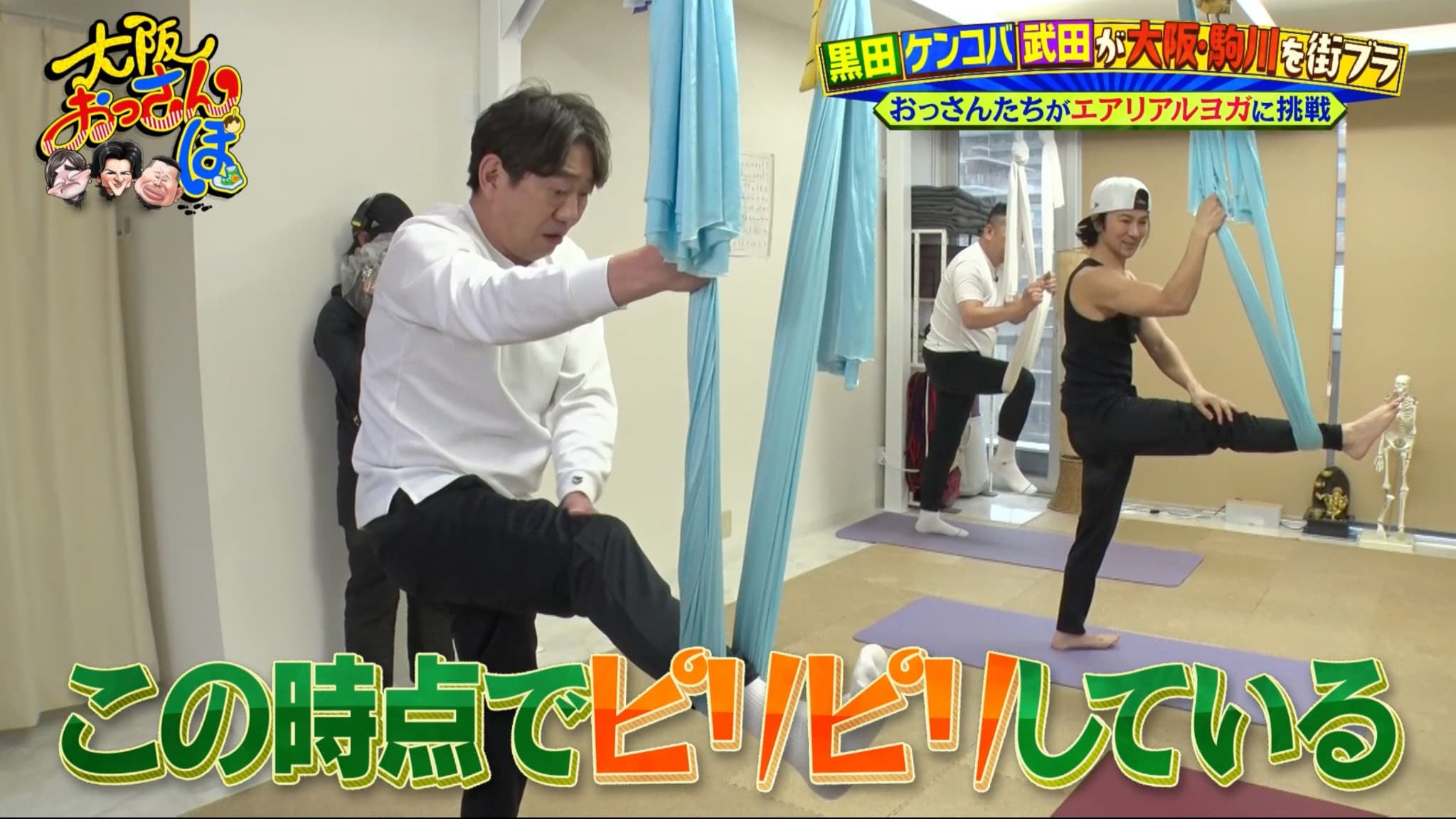 そこで一行は、エアリアルヨガが体験できる「studio Tula」を訪問。天井から吊るした布を使い、重力を味方につけて行うヨガに挑戦する。まずは初心者でもできる足のストレッチからスタート。「ホンマに硬い」という黒田は足を上げた瞬間、「ムリムリ!」と弱気に…。