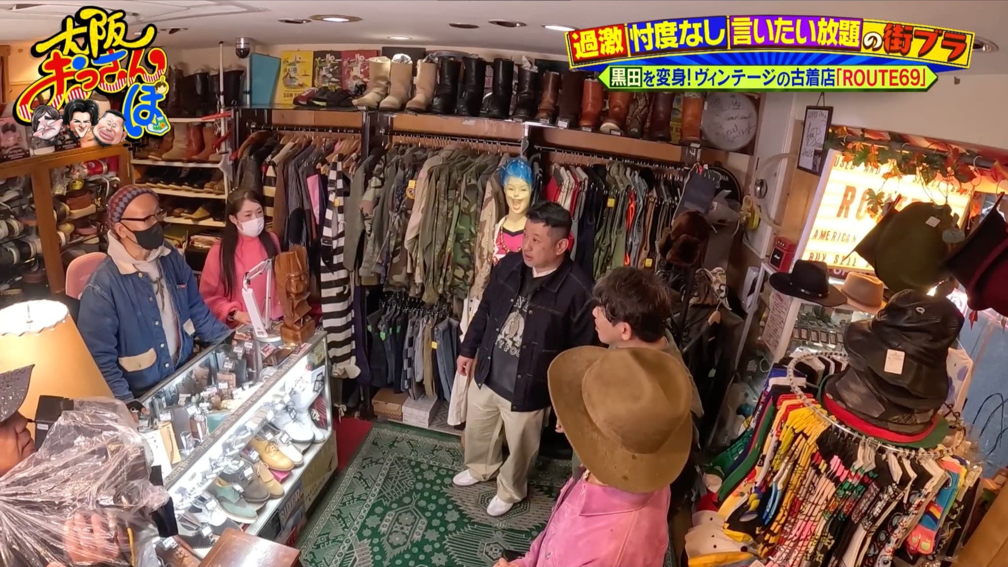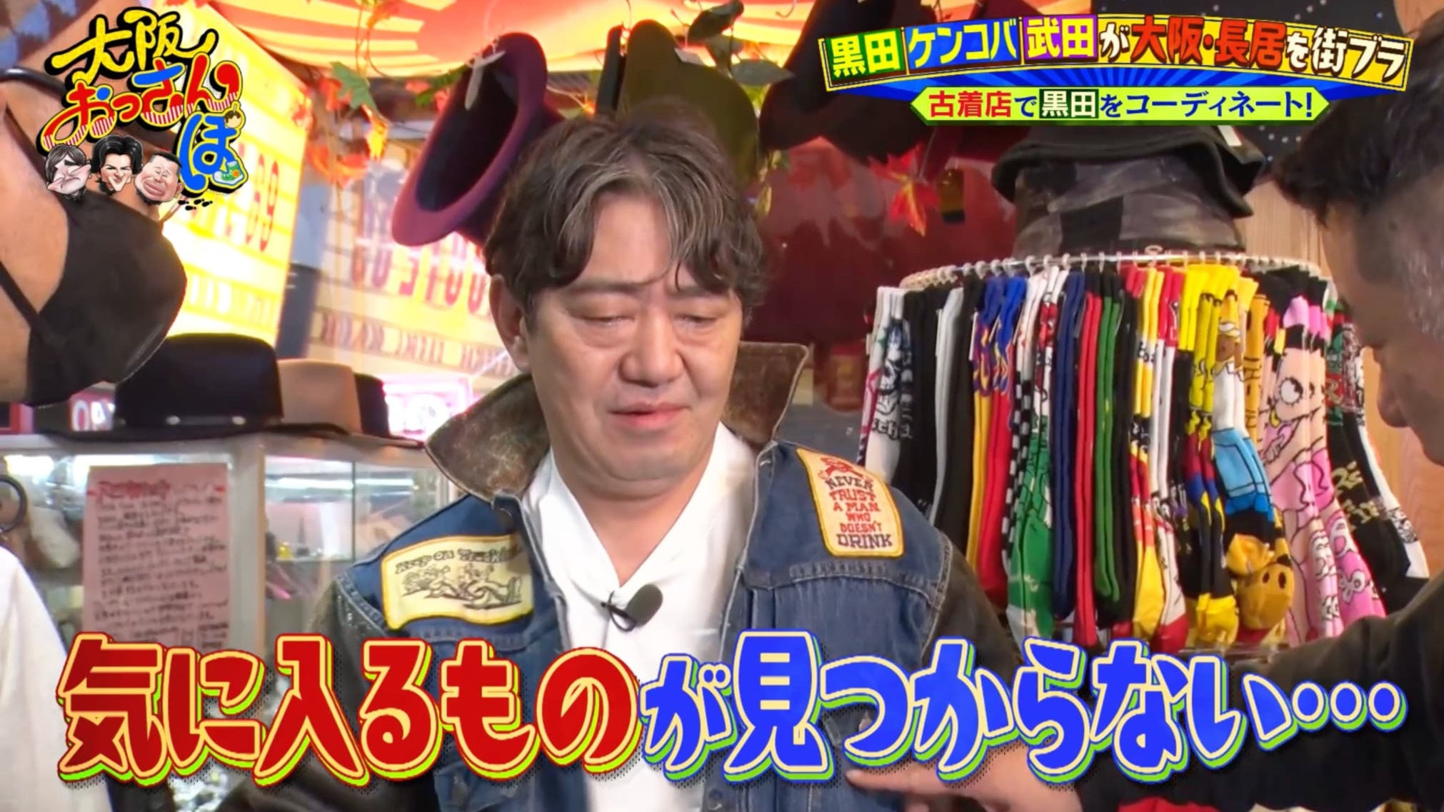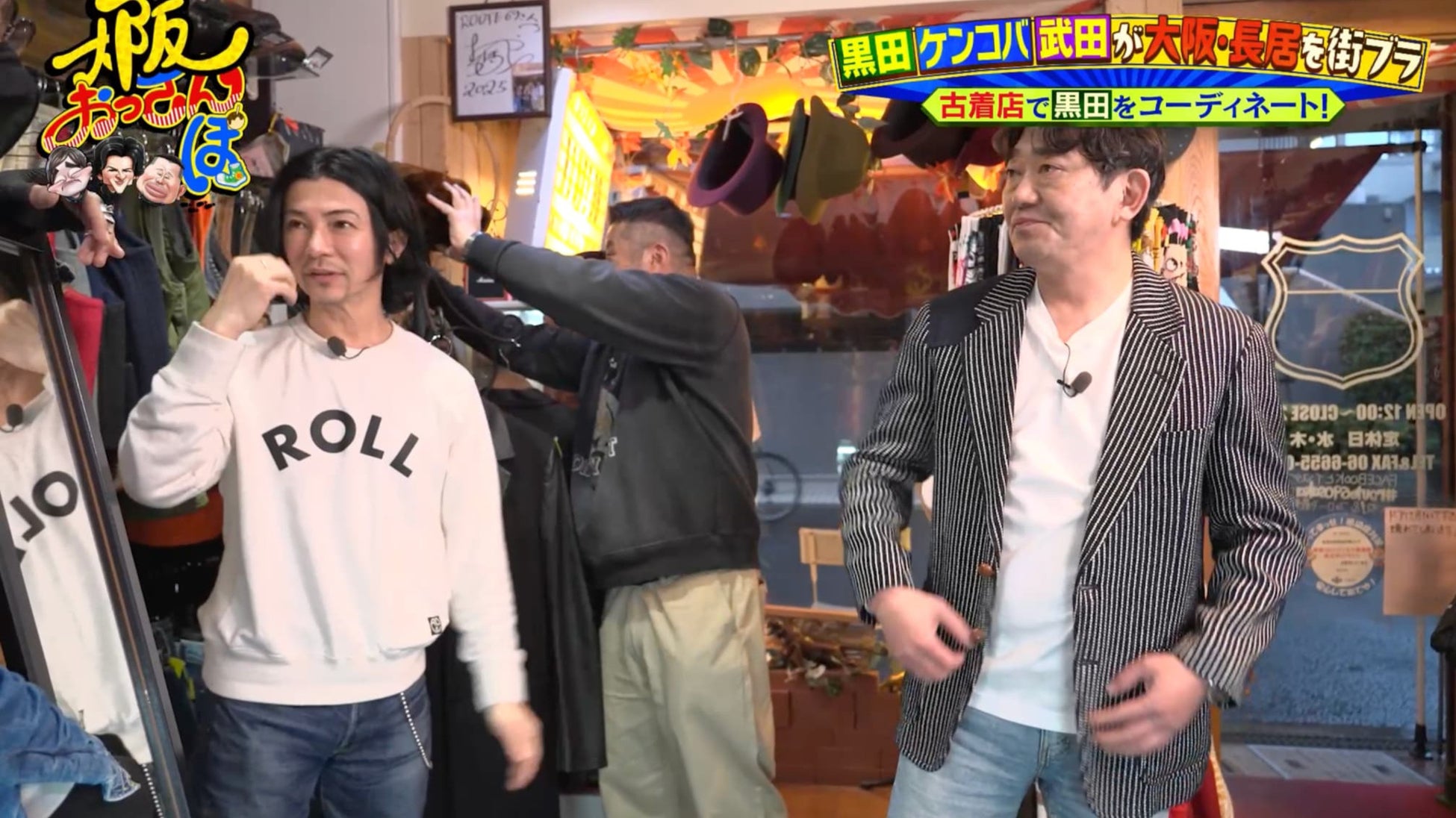 体をほぐした一行は、長居周辺の散策を開始。するとケンコバが「おしゃれな古着屋さんがあるらしい」と、やってきたのは古着店「ROUTE69」。ケンコバは「黒田さん、クソダサいから…」と続け、黒田は「誰がダサいねん! 普通やないか!」と吠える。