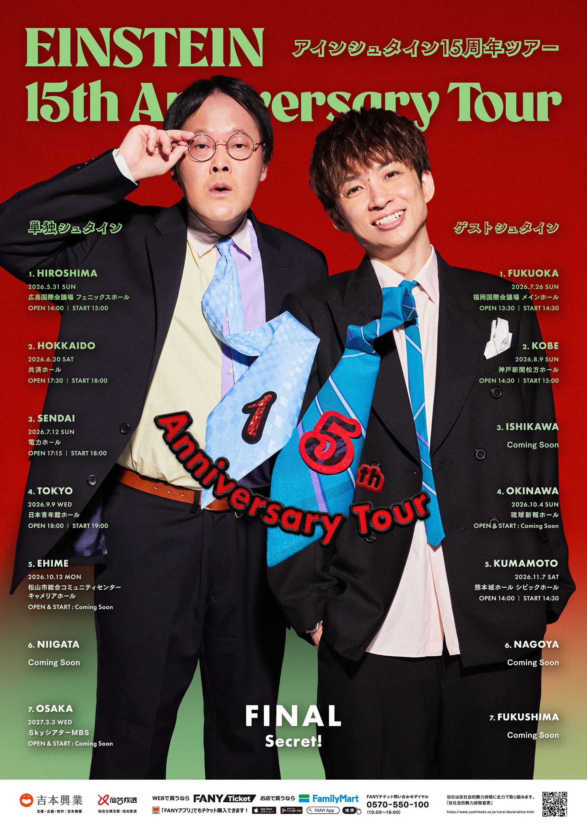 本ツアーは、2人のネタと独自の空気感を凝縮した「単独シュタイン」と、豪華ゲストを迎えたネタ&コーナー企画「ゲストシュタイン」の2本立てで展開。15年の歩みを詰め込んだ、アインシュタインならではのステージを各地でお届けします。