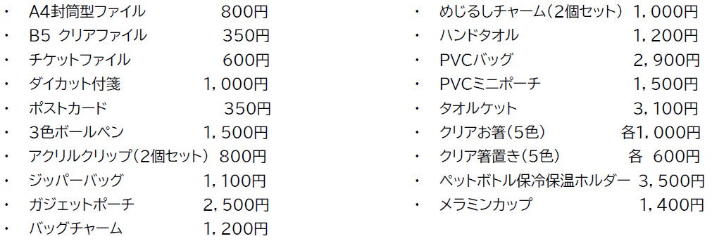 定番のクリアファイルやチケットファイルなどのステーショナリーに加え、普段使いの雑貨を多数ラインアップしています。PVC素材を使用したバッグやミニポーチは水回りでの使用にも適しており、タオルケットは冷房対策としても活躍します。
