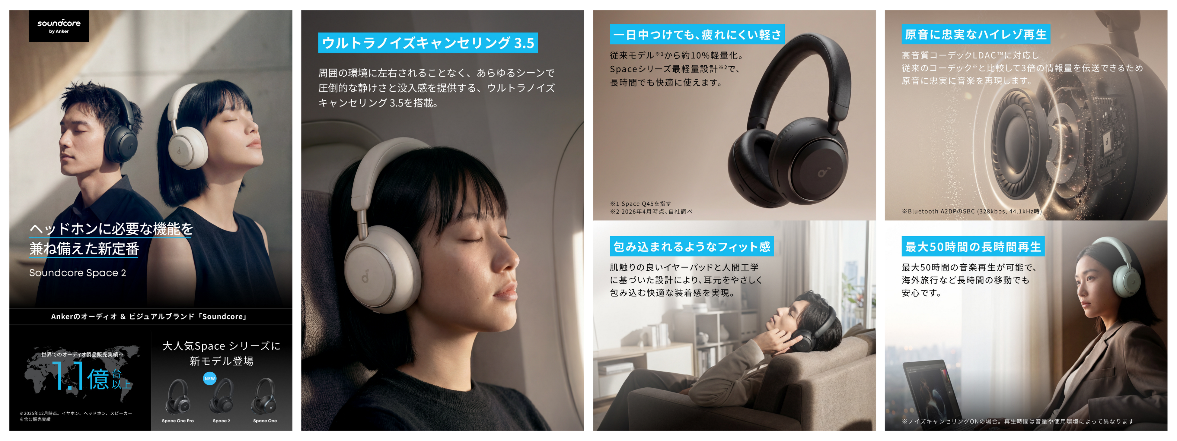 Soundcore Spaceシリーズにおけるワイヤレスヘッドホンの新たな定番モデルとして「Soundcore Space 2」を2026年4月27日(月)より販売開始。洗練されたデザインと快適な装着感だけでなく「ウルトラノイズキャンセリング 3.5」の搭載や長時間再生など、日常の様々なシーンで活躍する充実した機能性を備えた一台です。