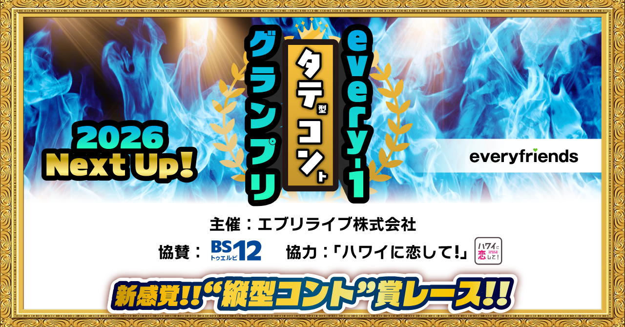 エブリライブ株式会社(本社:東京都港区、代表取締役:影山和義)が主催する、”お笑い”と”ライブ配信”がコラボした次世代のお笑い賞レース「every-1タテコングランプリ2026」の本戦イベント「every-1タテコングランプリ2026 Next Up! vol.2」を、2026年5月12日(火)に新宿バティオスにて開催することをお知らせいたします。