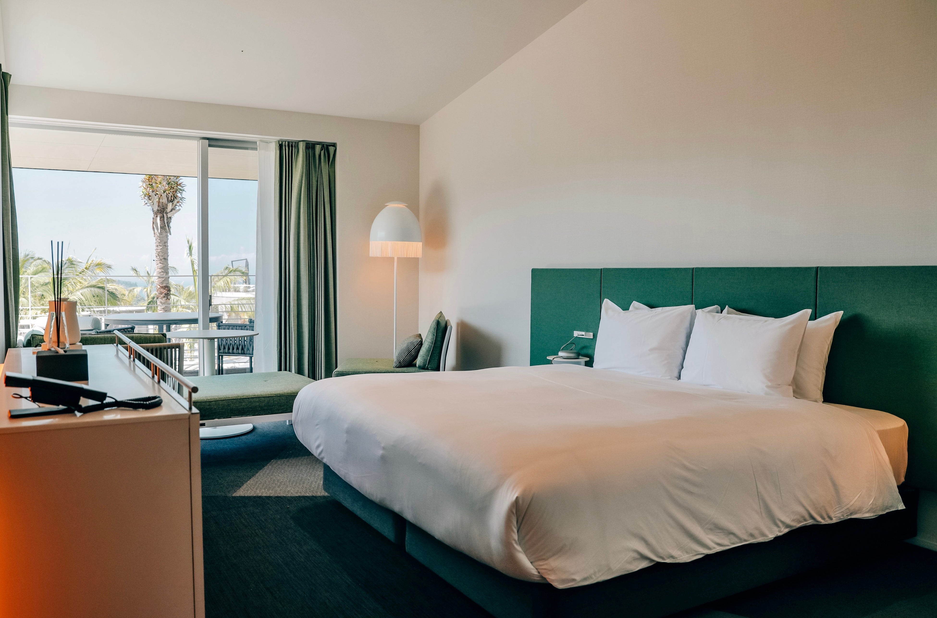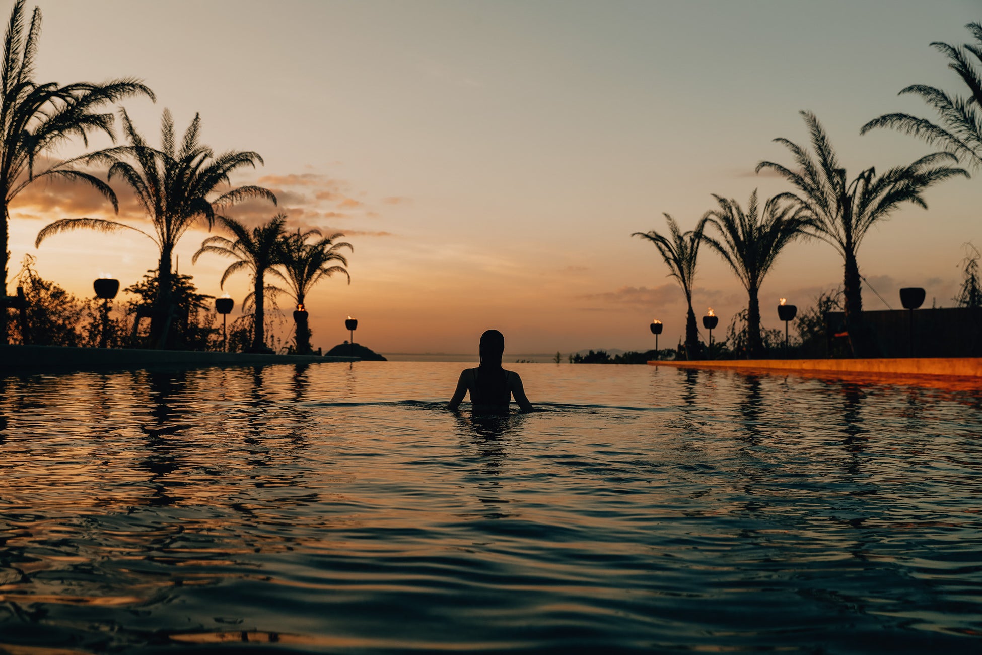 施設を象徴する2つのプールは、外気に合わせた水温で初夏でも楽しめます。全長40メートルのインフィニティプールは、空と水面が溶け合うような、圧倒的な開放感を演出。また中央にはパームツリーをあしらったまるで南国のようなプールサイドでは、プールベットでくつろぎながらゆったりと音楽を楽しむことができます。
