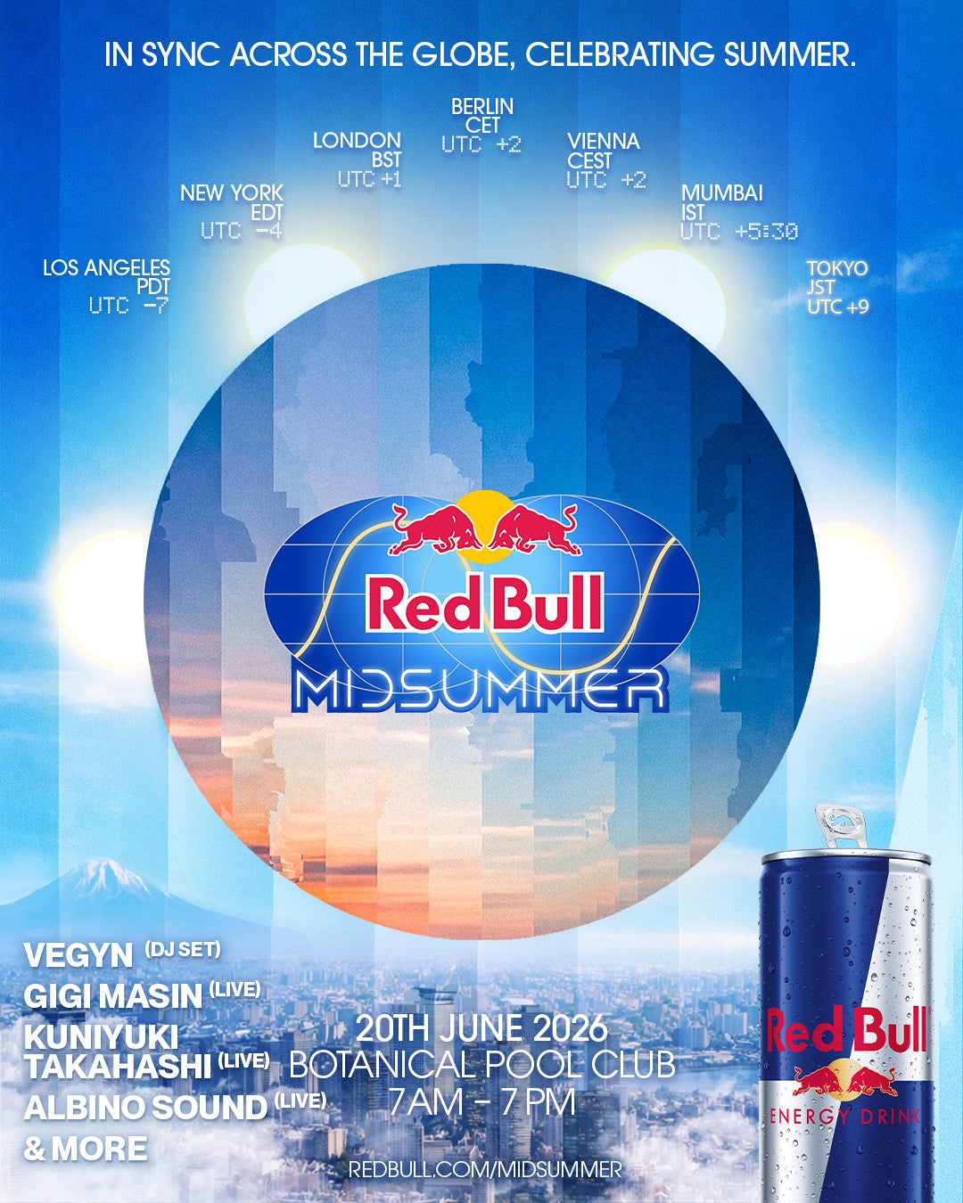 「Red Bull Midsummer」は、日本のほか、ムンバイ、ウィーン、ベルリン、ロンドン、ニューヨーク、ロサンゼルスの7都市・3大陸で同日に開催されます。日本からロサンゼルスまで、デイタイムパーティーを連続的に展開することで、世界のエレクトロニックミュージックカルチャーをひとつにつなぎます。