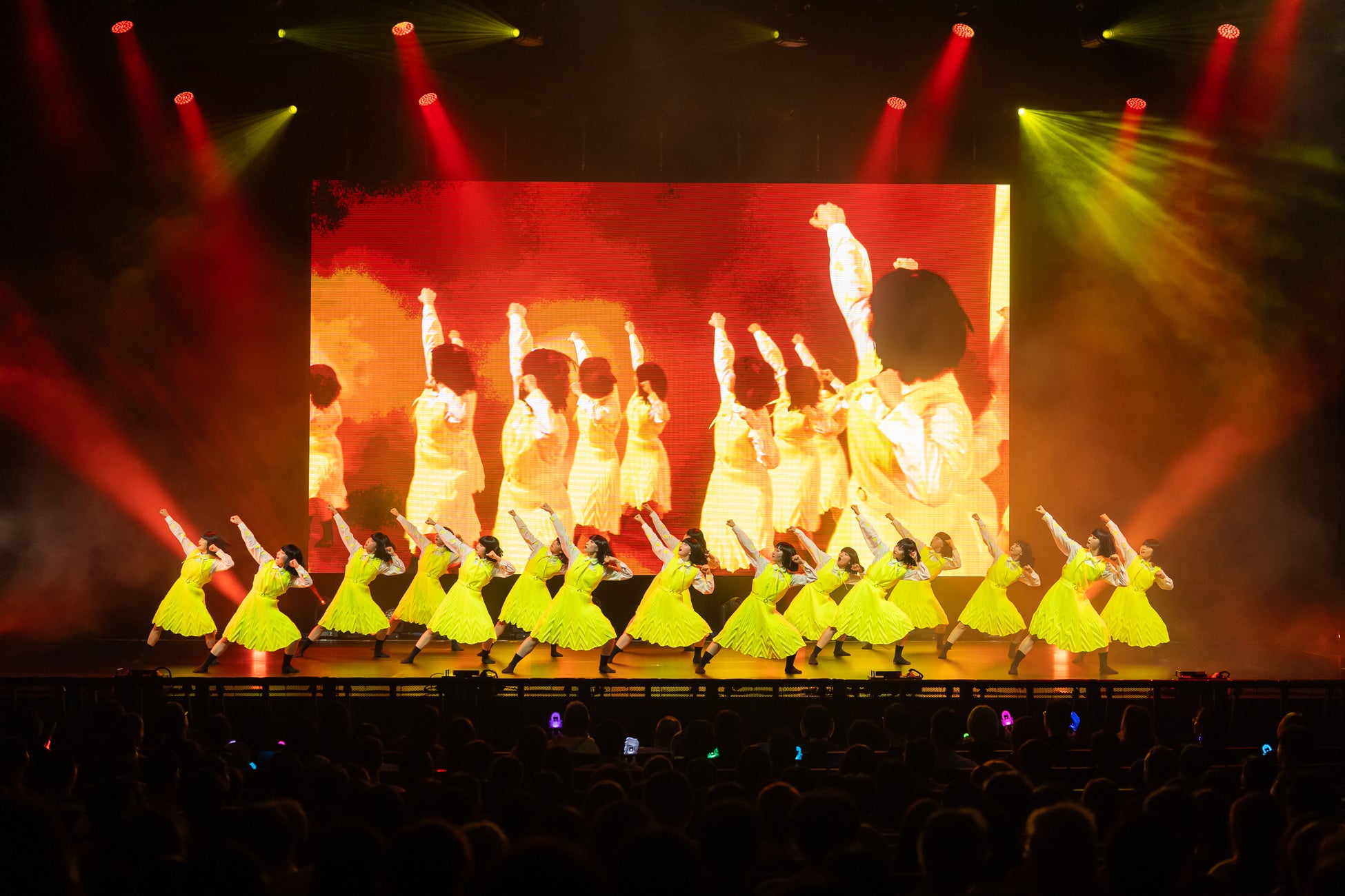 衣装は、象徴的な制服スタイルはそのままに、立体変形プリーツを取り入れたデザインが特徴。軽量な素材を採用し、スカートが美しく広がる演出効果を生んでいます。メンバーのみなさまからは「細かくプリーツが入っており、17人で踊ると舞台が一気に華やかになる」と高い評価をいただきました。