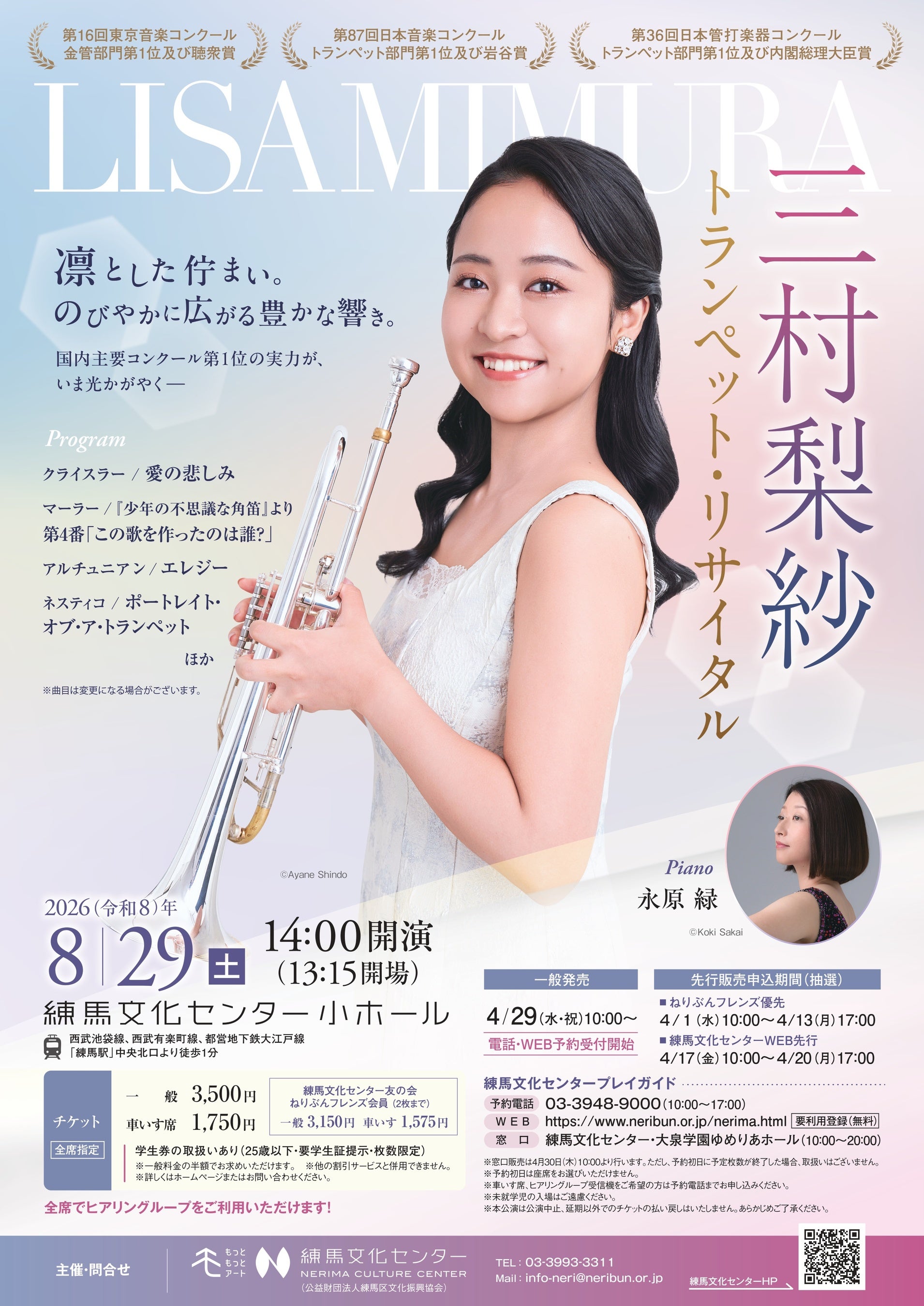 2026年8月29日(土)に練馬文化センター・小ホールにて、「三村梨紗 トランペット・リサイタル」を開催いたします。