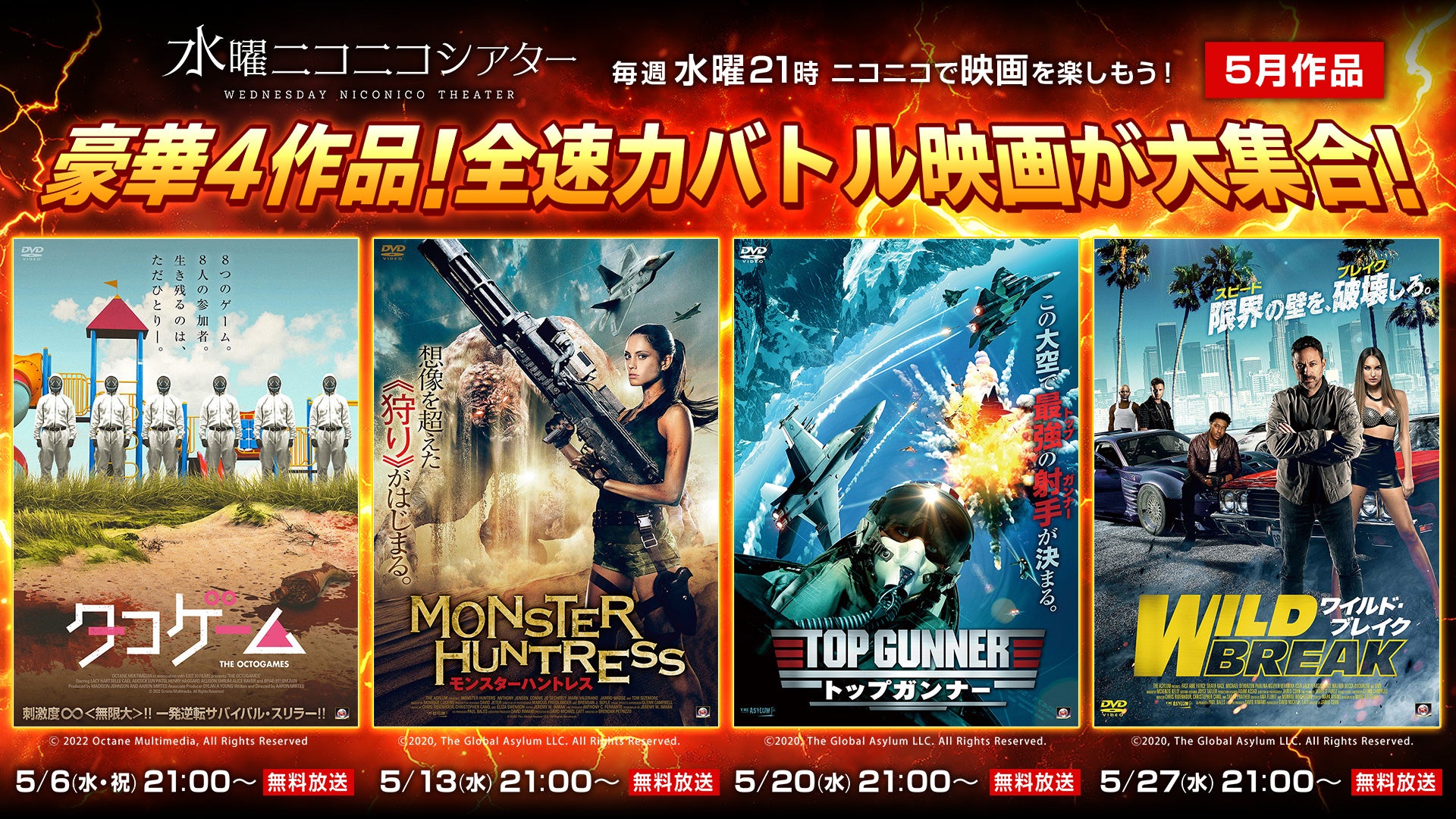 ニコニコ生放送では、5月6日(水・祝)より映画『タコゲーム』『モンスターハントレス』『トップガンナー』『ワイルド・ブレイク』を毎週無料上映いたします。