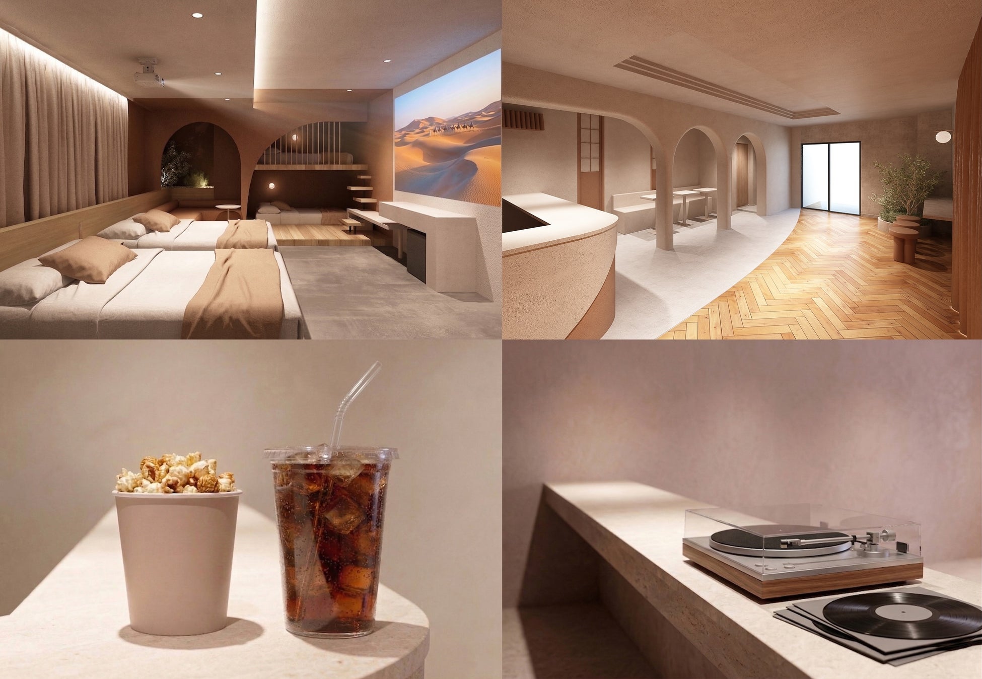 客室には、JMGOの4Kプロジェクター「N1S 4K」を標準装備。静けさに包まれた空間のなかで、時間を忘れて映画と向き合う贅沢なひとときを楽しめます。さらに、ポップコーンやソフトドリンクの無料サービスも用意されており、自分だけの上映体験をより一層盛り上げてくれます。ラウンジにはレコードプレーヤーと高音質スピーカーを設置。日替わりで流れる映画音楽に耳を傾けながら、作品の余韻にゆったりと浸ってみてはいかがでしょうか。