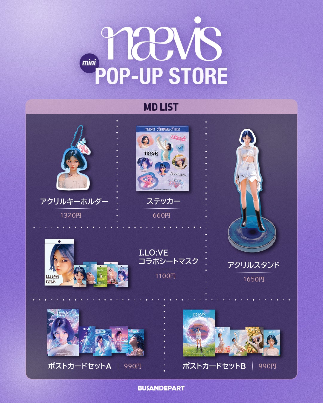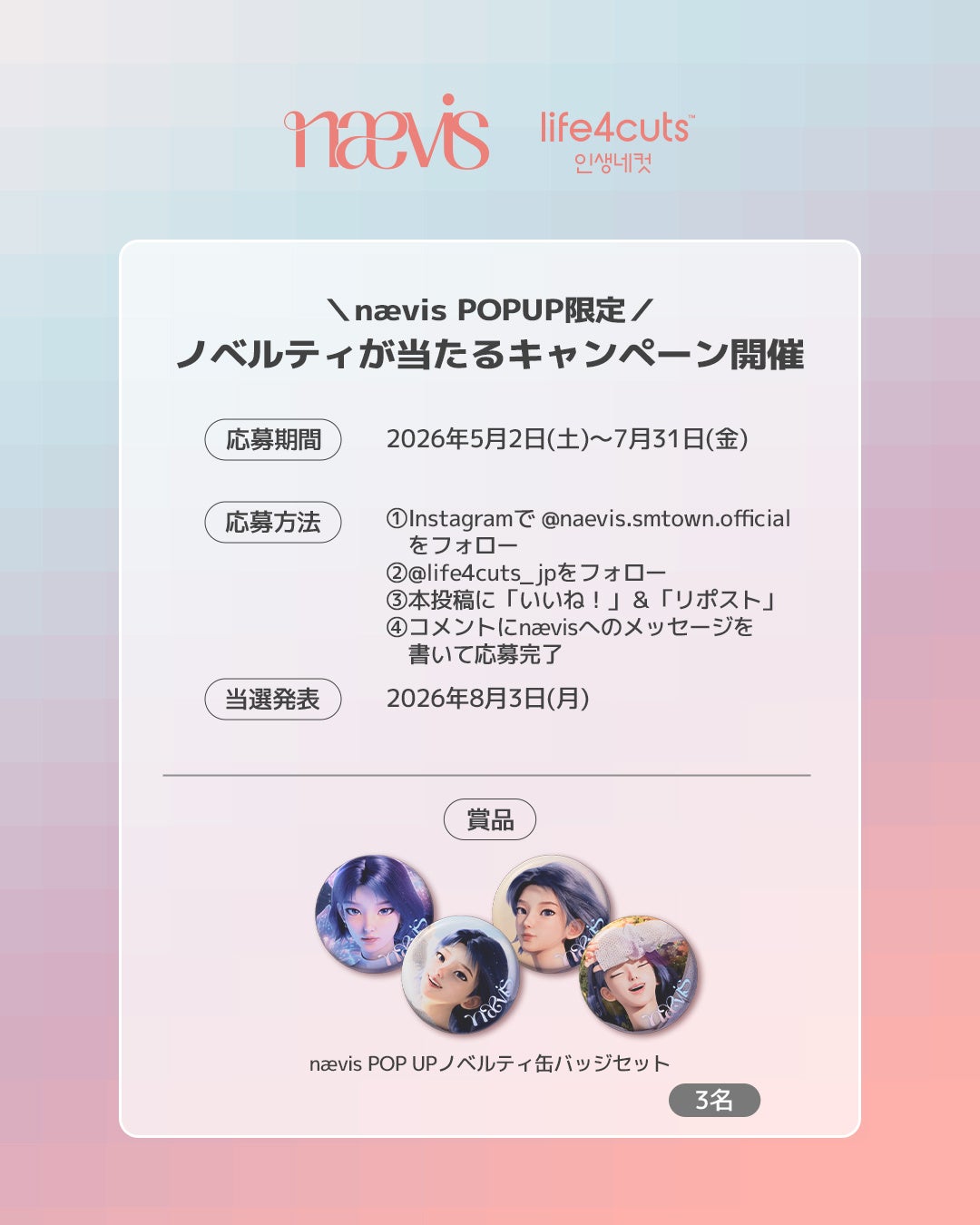 本ポップアップストアでは、ここでしか手に入らないオリジナルグッズの販売に加え、限定ノベルティの配布など、ファンの皆様にお楽しみいただけるコンテンツをご用意しております。さらに、同ブース内に設置される「人生4カット」では、nævisのオリジナルコラボフレームが登場し、特別な撮影体験をお楽しみいただけます。