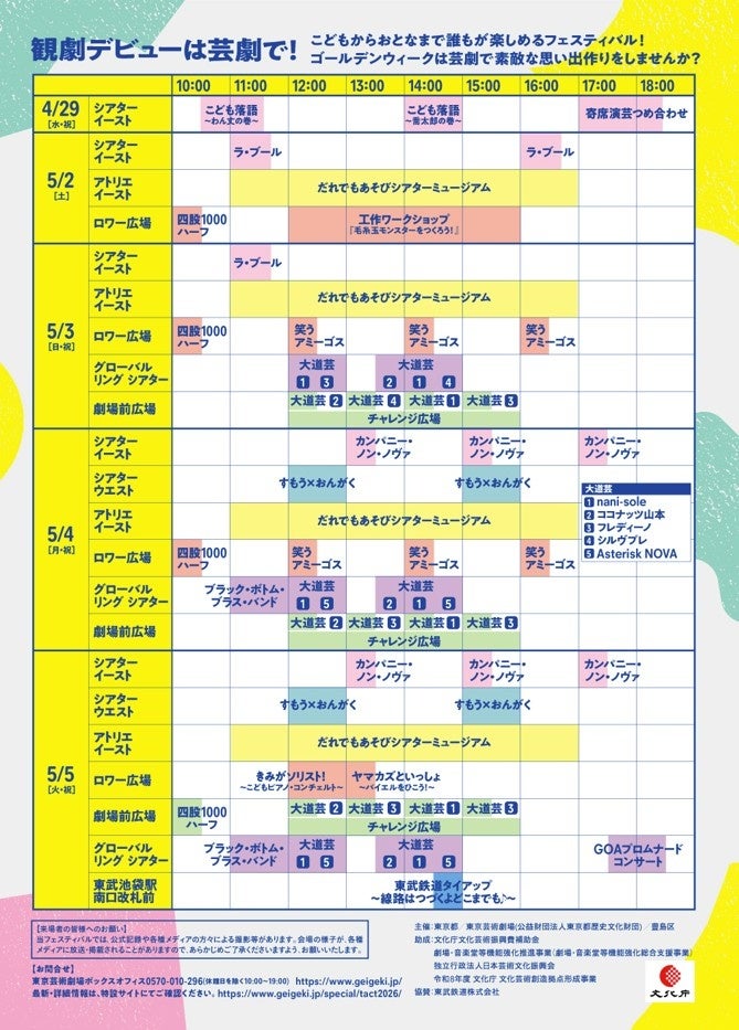 こどもからおとなまで誰もが楽しめるTACT (Theatre Arts for Children and Teens) FESTIVAL が、4/29(水・祝)に開幕、東京芸術劇場をメインに、有料のシアター・プログラムから無料プログラムまで、全16演目66公演をお届けします。