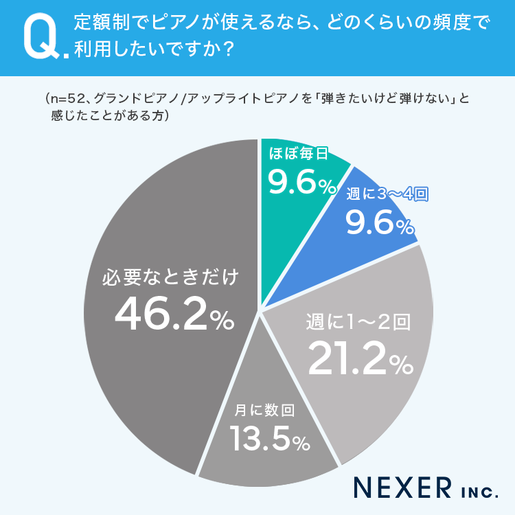 続いて、「弾きたいけど弾けない」と感じたことがある方に、定額制でピアノが使えるならどのくらいの頻度で利用したいかを聞いてみました。