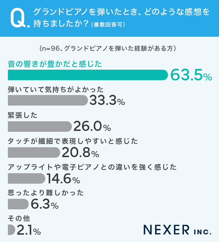 次いで「弾いていて気持ちがよかった」が33.3%、「緊張した」が26.0%、「タッチが繊細で表現しやすいと感じた」が20.8%と続きました。
