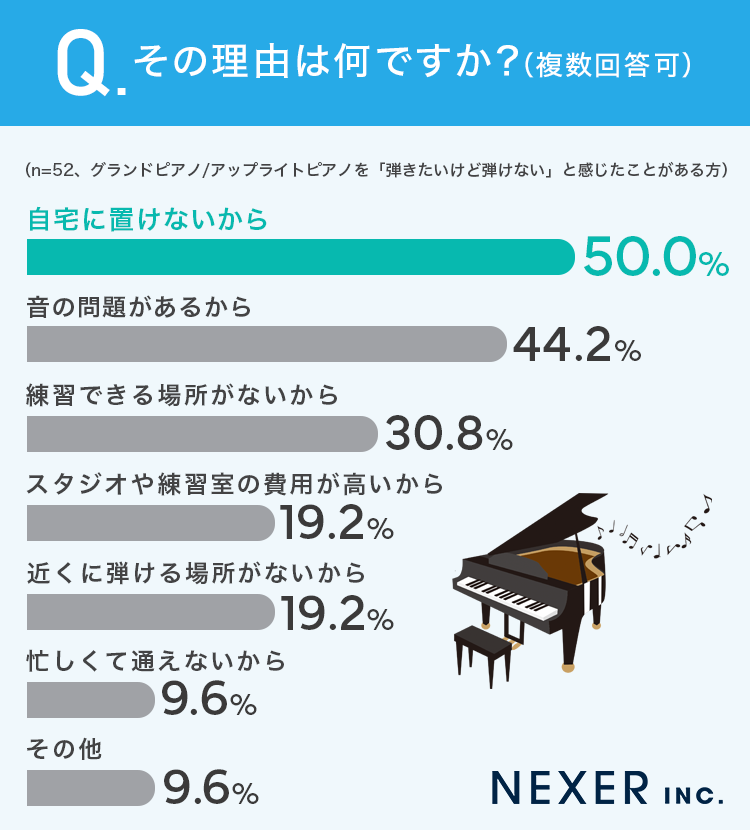 次いで「音の問題があるから」が44.2%、「練習できる場所がないから」が30.8%、「スタジオや練習室の費用が高いから」と「近くに弾ける場所がないから」がそれぞれ19.2%で並びました。
