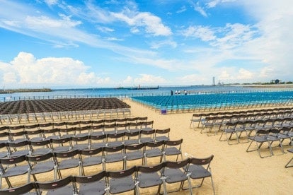 砂浜に設置されたパイプ椅子席です。正面から迫力のある花火演出をご観賞いただけるスタンダードなお席。
