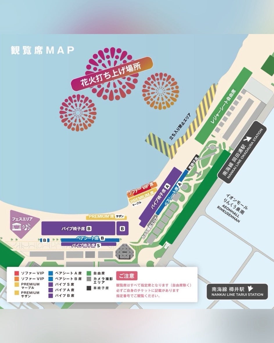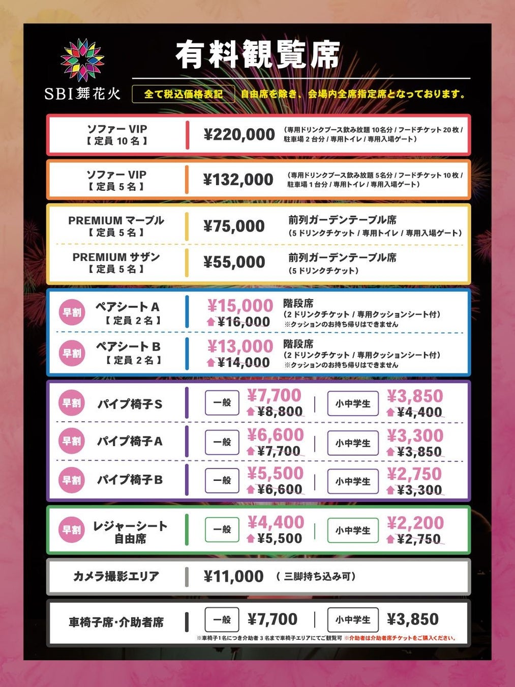 SBI舞花火は有料エリアからのみ最高の視聴覚体験が可能な演出となっており、花火の美しさと迫力を最大限にお楽しみいただけます。安全運営を実現すべく、側面や後方からのご観覧は制限いたしますので予めご了承ください。ご入場いただく皆様に、特別な場所で最高の花火ショーをお楽しみ頂けるよう全力で努めて参りますので、ご理解とご協力を賜りますようお願い申し上げます。