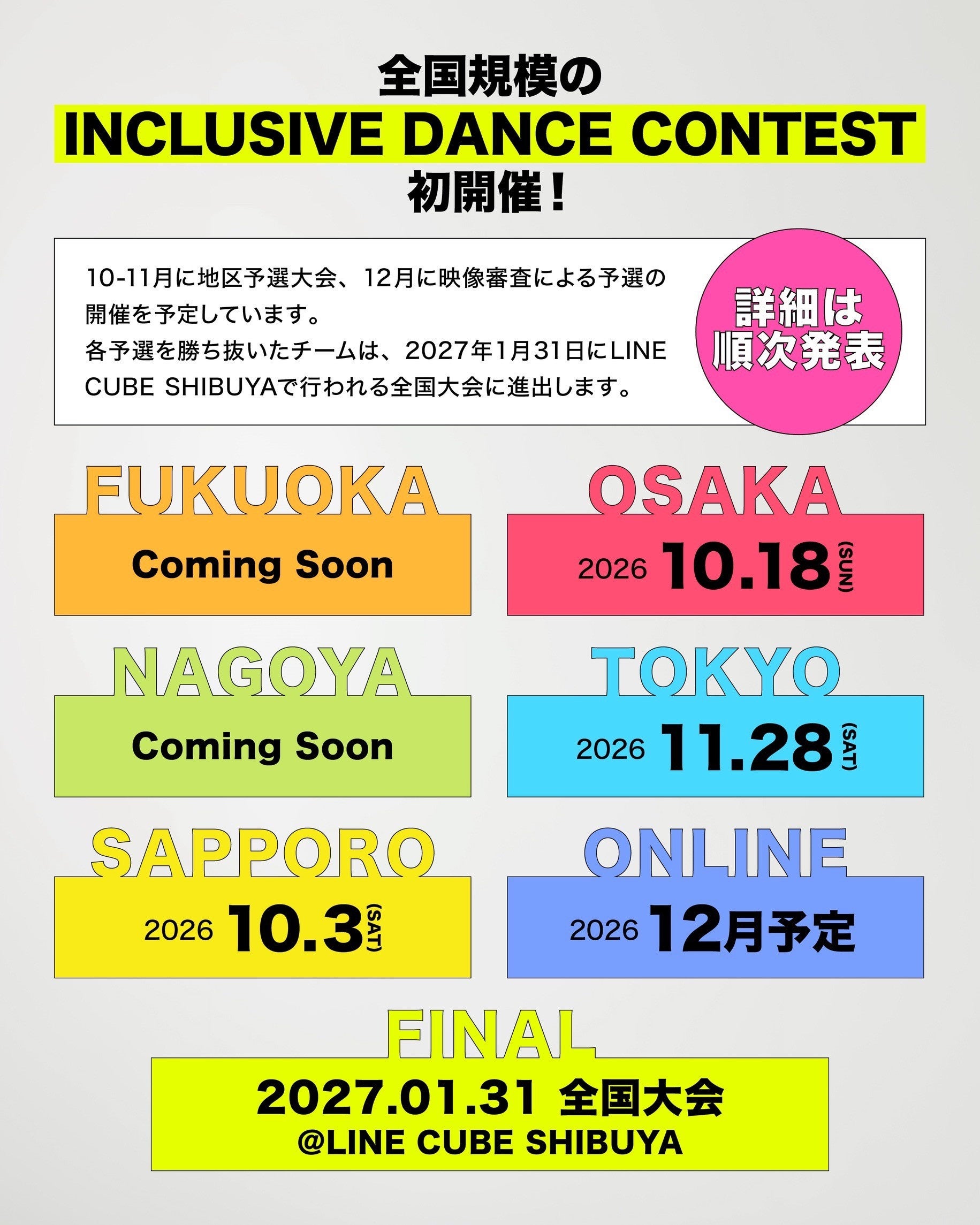 「INCLUSIVE DANCE FES 26-27」では、障害のある・ないダンサーが1つのチームとなって生み出す、新たなクリエイティビティとオリジナリティを競い合う全国規模のダンスコンテストを行います。来年1月31日に「LINE CUBE SHIBUYA」にて開催される全国大会に先駆けて、10月から12月にかけて東京・大阪・名古屋・福岡・札幌・オンラインで予選大会が行われます。