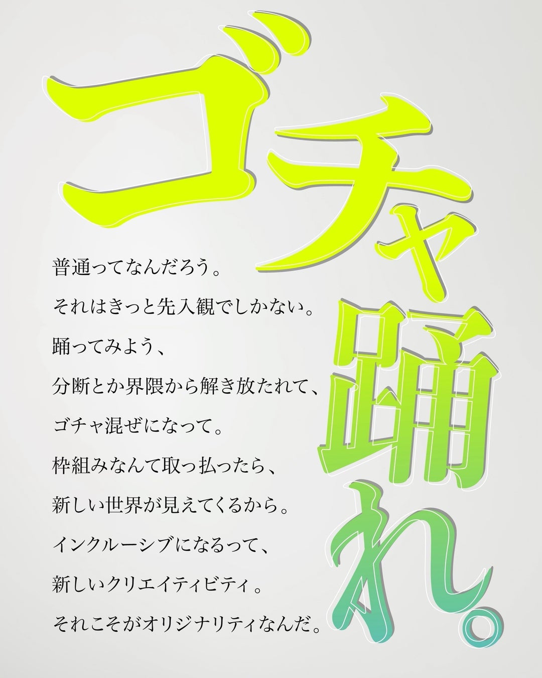 障害のある・ないダンサーが1つのチームとして生み出す、新たなクリエイティビティとオリジナリティを競い合う、世界でも類を見ないダンスコンテストをメインコンテンツとして、全国規模で障害のあるなしを超えて、誰も参加できるダンスのムーブメントを広げるプロジェクト。26―27の初開催をきっかけに、今後すべての人が「ごちゃ踊れ。」のコピーのもと踊ることを介してつながることを目指す取り組みです。全国大会参加チームを選出する全国5都市での地区予選に先駆けて、5月からチームづくりの場となるワークショップを各地で実施します。