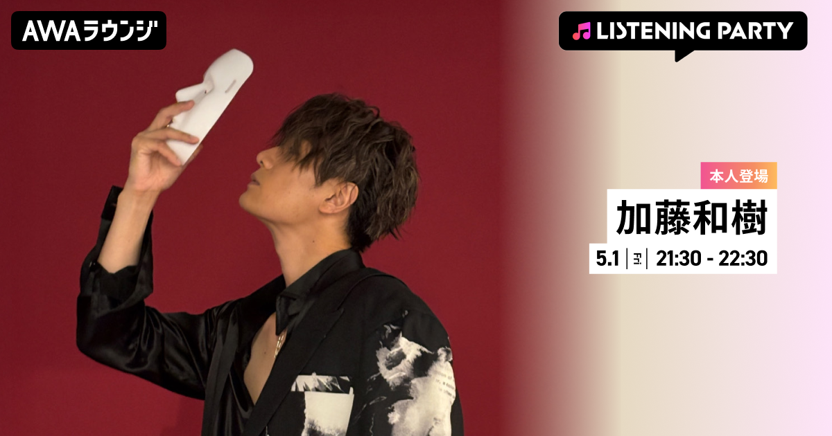 AWA株式会社(本社:東京都港区、代表取締役CEO:冨樫晃己)が運営する、サブスクリプション型(定額制)音楽ストリーミングサービス「AWA(アワ)」は、2026年5月1日(金) 21:30~22:30にて、無料で誰でも参加できるオンライン空間「ラウンジ」で、加藤和樹が音声とチャットで登場する特集ラウンジを開催いたします。