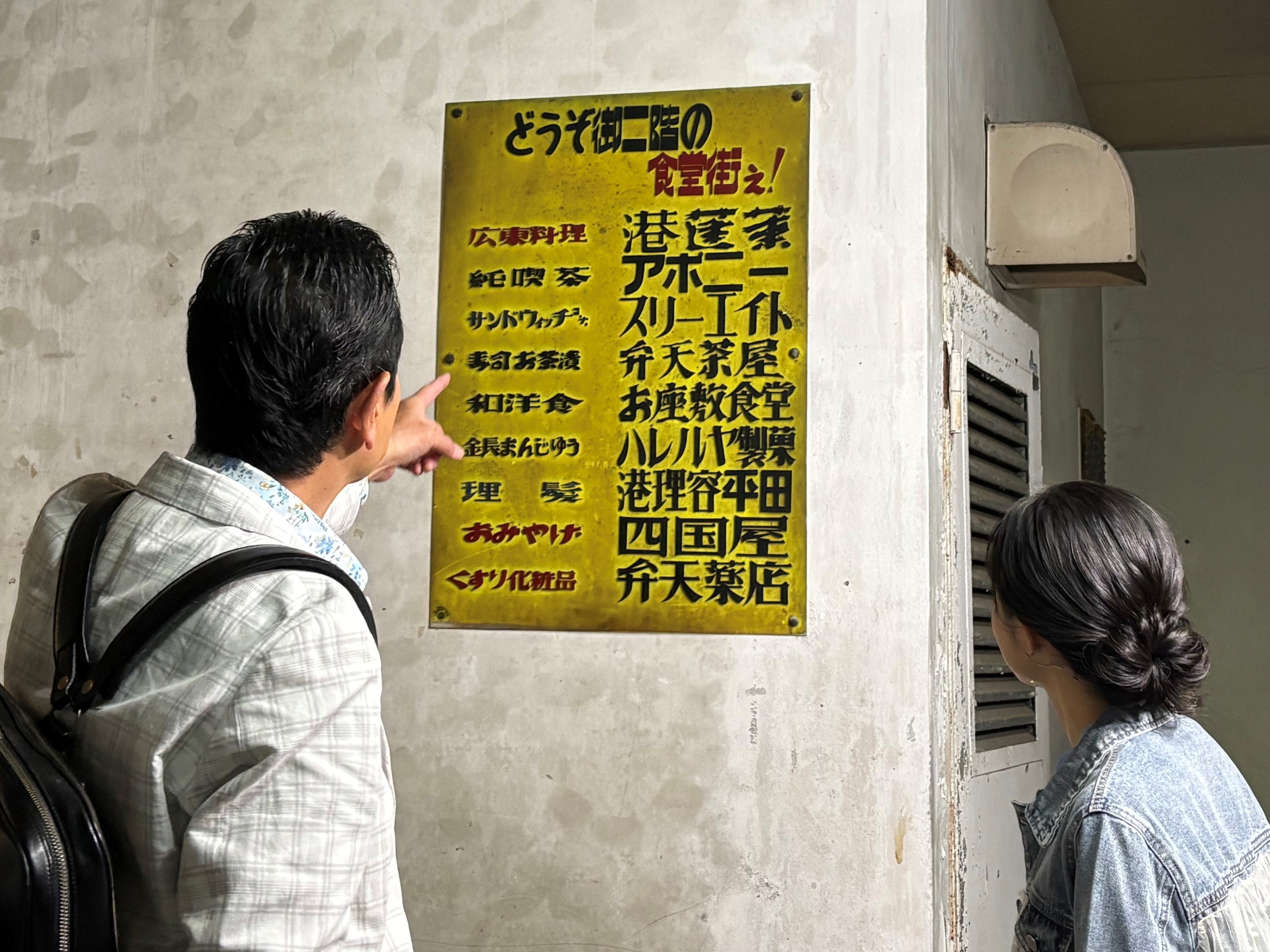 散策中に見つけた建物。失礼ながら、ちょっと廃墟にも見えます。実は、かつてフェリーターミナルだった建物で、今はテナントビルになっているんです。2人は2階にあるコーヒー店を目指し、ビルの中へ!のりばの案内表示や昔の看板があちらこちらに残っており、不思議とワクワクしてきます!