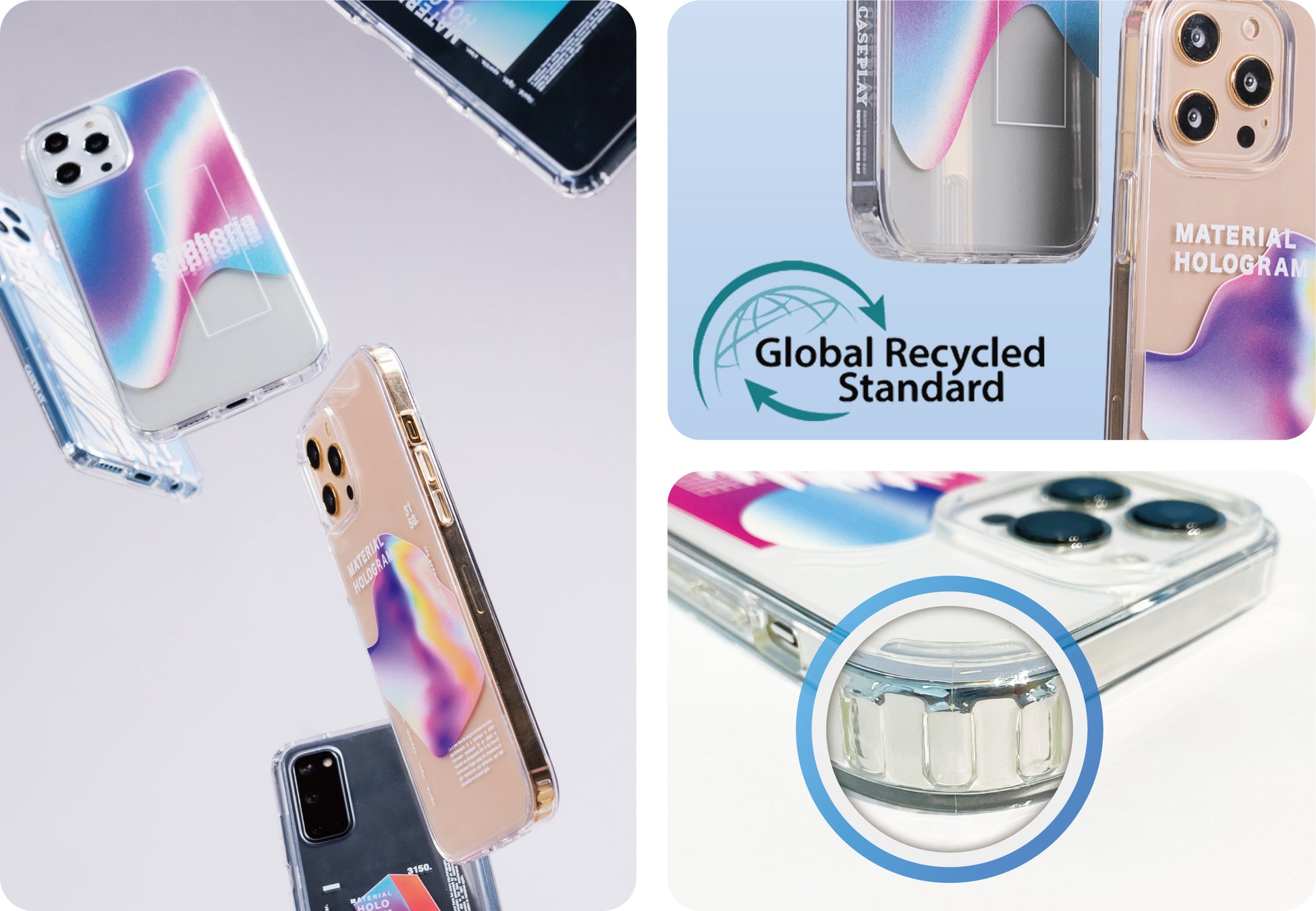 製品のリサイクル含有物を検証し、環境配慮など社会的責任を果たした上で生産されているかを証明するマークです。CASEPLAYのスリムプロテクションケースは、消費者が使用した後の樹脂製品(ポストコンシューマー)を100%用いて製造されています。