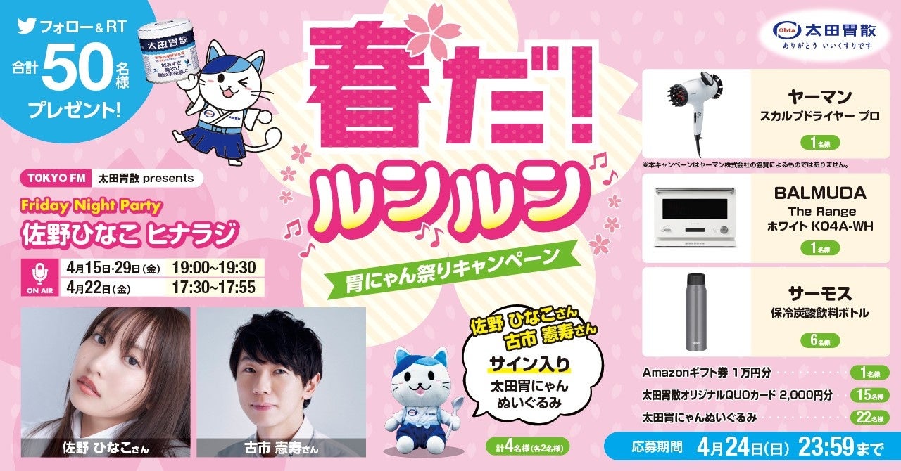 本キャンペーンは同社が提供しているTOKYO FM1ヶ月間限定プログラム『太田胃散 presents Friday Night Party 佐野ひなこ ヒナラジ』(4月15日・29日(金)19:00~OA、22日(金)17:30~OA)とのコラボ企画となっておりますので、ぜひ番組もお聴きください。