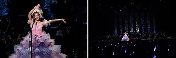 また会場ロビーでは、過去のシンフォニック・コンサートで実際に着用した衣裳を展示。初日の東京では、2019年のbillboard classics公演で使用したドレスがディスプレイされた。深い海と波を思わせるエメラルドブルーと白のグラデーションカラー、トップス部分にあしらわれたクリスタルの輝きが鮮やかで、オーケストラ公演ならではの衣裳の絢爛豪華さに、ファンたちも目を奪われているようだった。なお、各会場ごとに異なるドレスを展示予定なので、これから行われる2公演でどんな衣裳が見られるのか、楽しみにしたい。