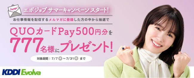 株式会社KDDIエボルバ(本社:東京都新宿区、代表取締役社長:若槻肇、以下KDDIエボルバ)は、7月7日~7月31日の期間中、BPO・コールセンター/コンタクトセンターの求人サイト「エボジョブ」のメルマガにご登録いただいた方から抽選で777名の方にQUOカードPay※1 500円分をプレゼントする「エボジョブ サマーキャンペーン」を全国で実施いたします。
