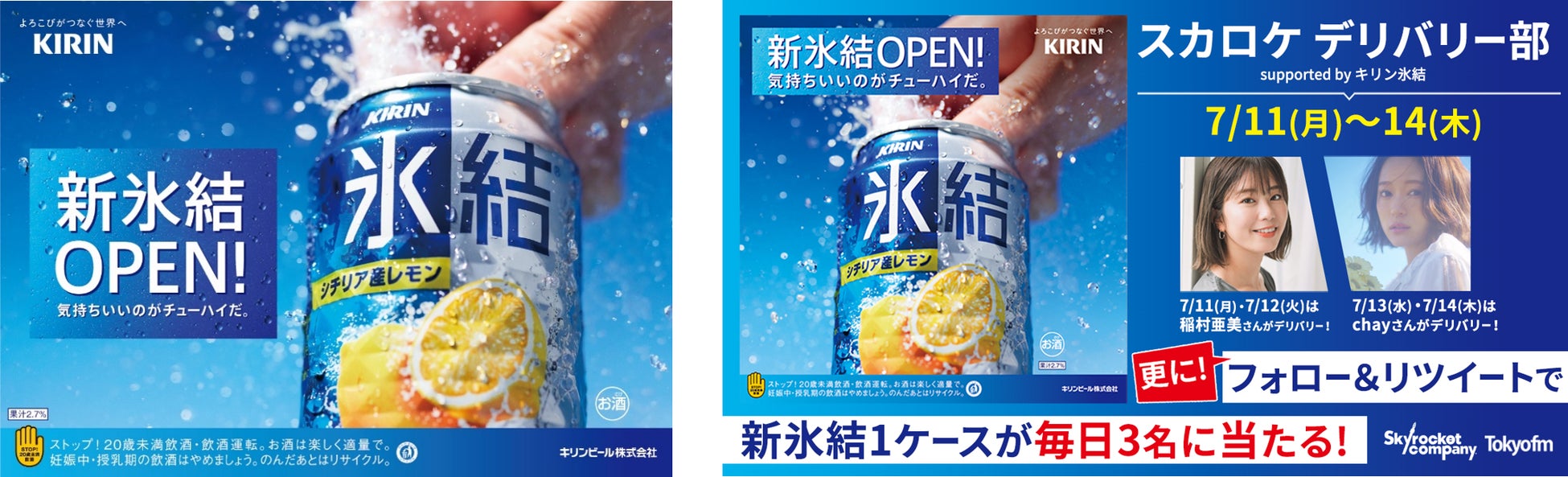 TOKYO FM「Skyrocket Company」 とコラボレーションする『スカロケ デリバリー部 supported byキリン 氷結®️』では、タレントの稲村亜美さんとシンガーソングライターのchayさんが新「氷結®」を直接、当選した方へ届ける企画です。7月11日(月)〜14日(木)の4日間、ご応募いただいた方の中から抽選で毎日1名ずつ、「キリン 氷結®️シチリア産レモン」をお届けにご自宅にお伺いし、その様子を番組内で生中継します。