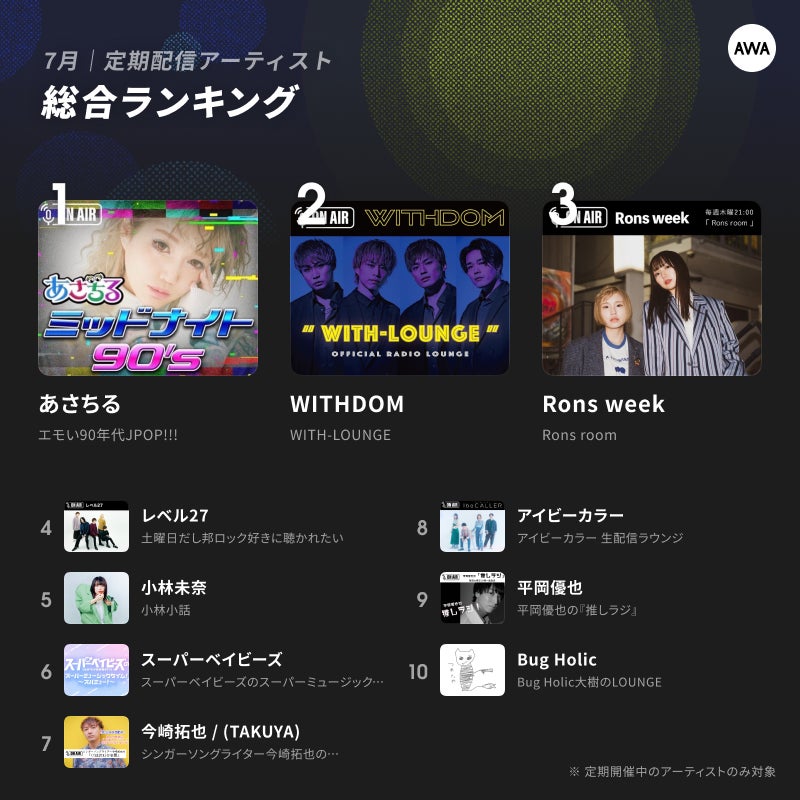 2022年7月度のラジオ配信ラウンジランキングで1位に輝いたのは、計54回のラジオ配信ラウンジを開催した、京都出身のポップアイコンあさちる。5ヶ月連続での1位獲得となります。2位には、毎週火曜日22時からメンバーが週替わりで配信している、京都発4人組ボーカルグループWITHDOMの「WITH-LOUNGE」が獲得。約1時間の開催でのユーザー滞在率やスタンプ数の比率など、温度感の高いユーザーを多く獲得し、前月から順位を上げて2位に輝いています。3位には、6月からラジオ配信ラウンジを開始した2人組シンガーソングライターユニットの「Rons week」が、前月からひとつ順位を上げてトップ3にランクイン。その他、7月17日の初回配信以来、毎日開催したアイドルヒーローのスーパーベイビーズや、アイビーカラー、今崎拓也など、7月に新規配信を行ったアーティストもTOP10に名を連ねています。