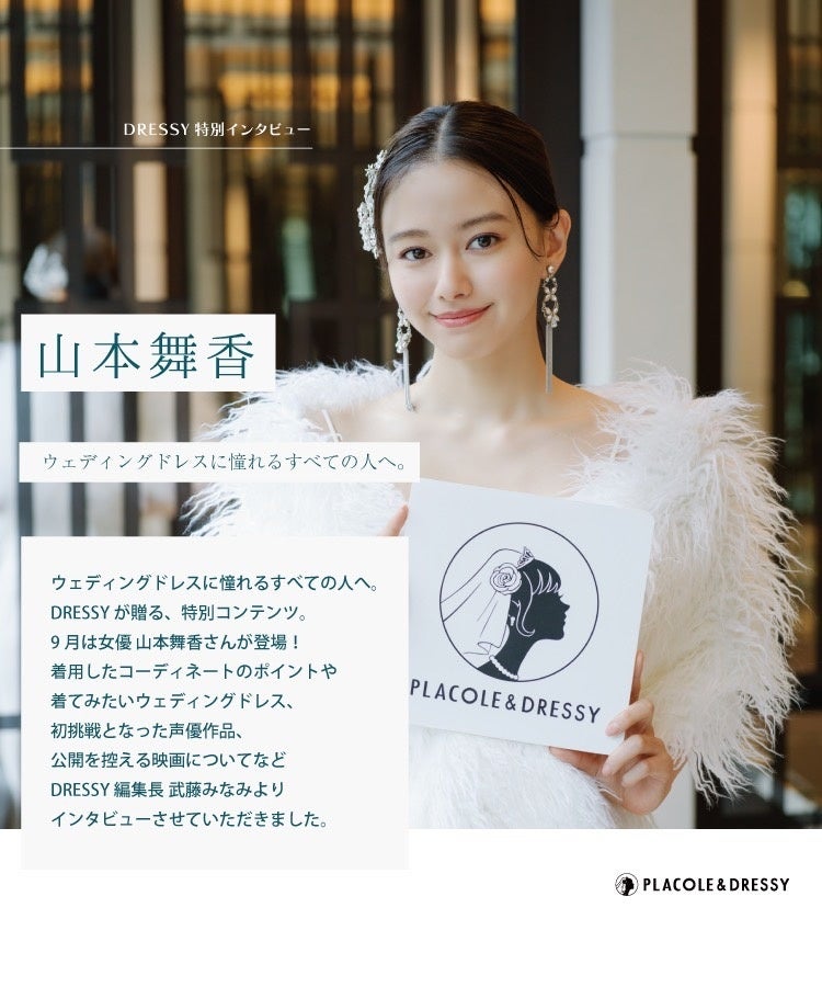 「PLACOLE & DRESSY」ブランドを展開する、冒険社プラコレ(本社:神奈川県鎌倉市、代表取締役CEO:武藤功樹)は、ウェディングドレスをもっと身近に楽しんで欲しいと考え「ウェディングドレスに憧れるすべての人へ」PLACOLE&DRESSYが贈る、特別コンテンツをスタート。今月2022年9月は女優 山本舞香さんを迎え、メッセージを頂きました。