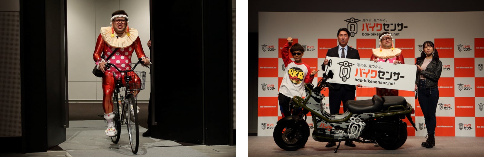 最後には、バイク川崎バイクさんの持ちネタであるBKBになぞって、今回のバイクセンサーを使用した感想を、BDSで表現するように問われたくっきー!さん。お手本を見せるといったバイク川崎バイクさんは「ばっちり(B)大満足で選べる(D)車種(S)」と大きな声で決めポーズ。続いてくっきー!さんからは、「僕ですか(B)出汁は(D)すすりません(S)」とまさかの回答も飛び出し、会場は終始笑いの絶えない様子が続きました。