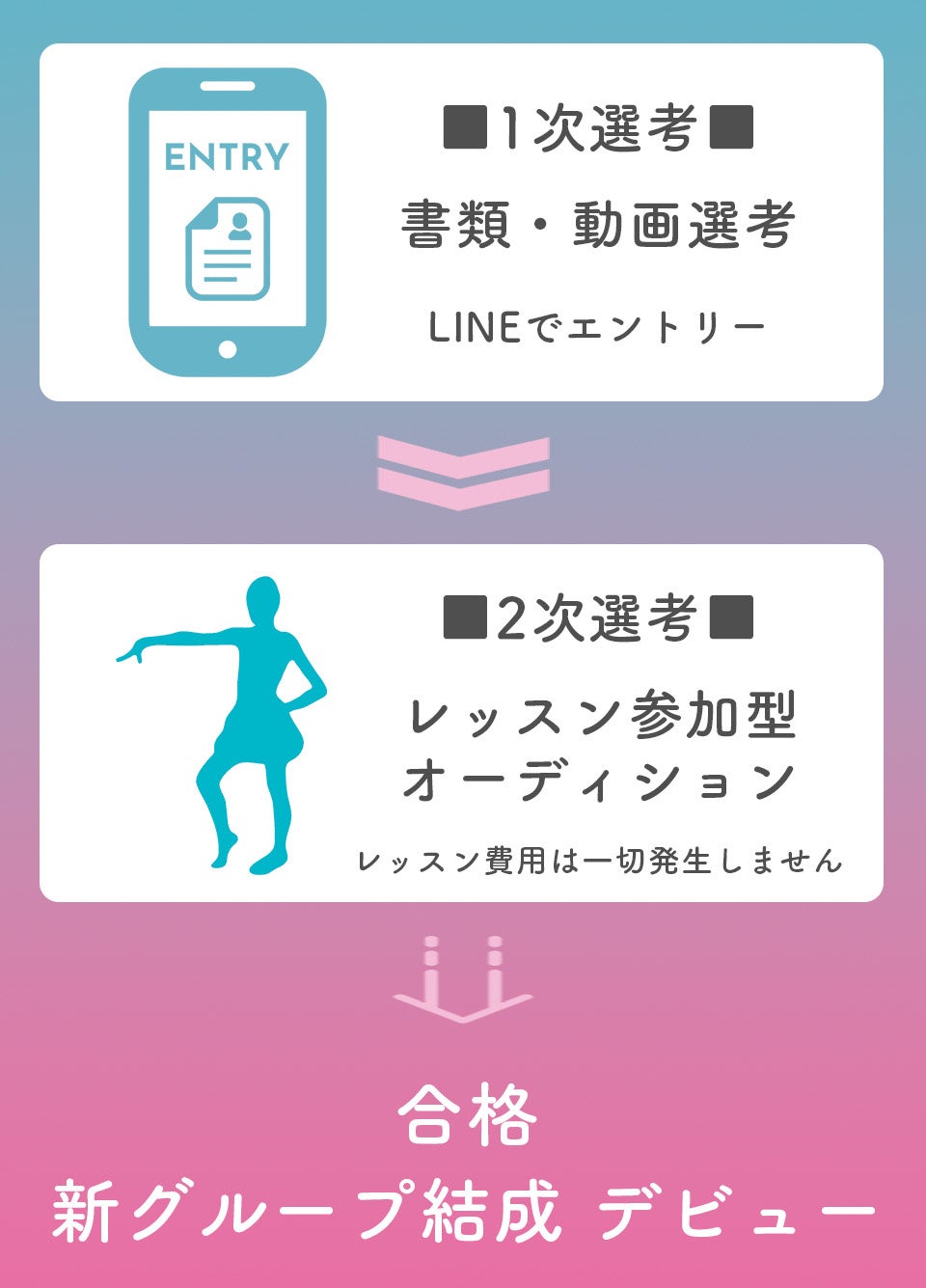 エントリーはLINEアプリから手軽に行え、1次選考通過者は、無料でアイドルレッスンに参加出来ます。