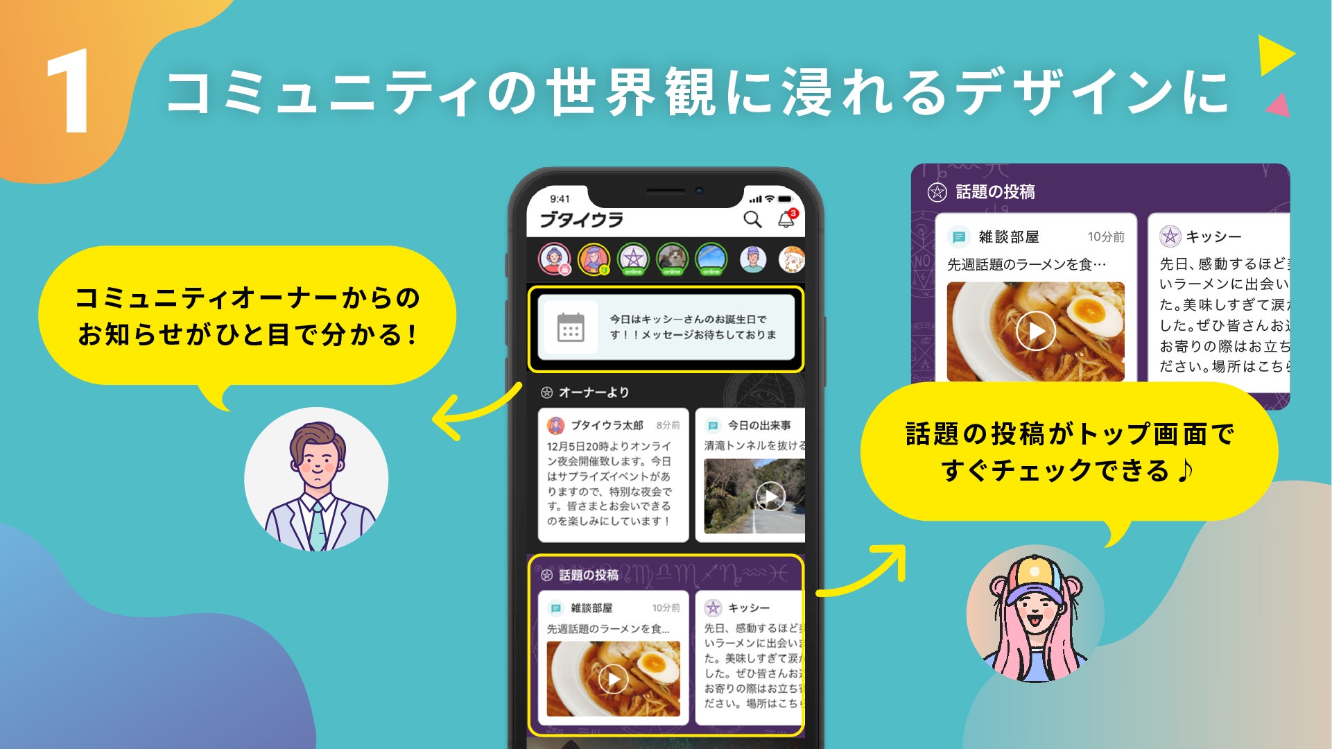 トップページのデザインカスタマイズが可能になり、オーナーの独自のカラーを反映できるようになりました。オーナーからのお知らせがひと目で分かるバナーエリアも追加され、オーナーの投稿や話題の投稿がすぐに見られるように!その他にも、コミュニティロゴをヘッダーに入れ、コミュニティへの所属感がより高まるデザインに変更しました。