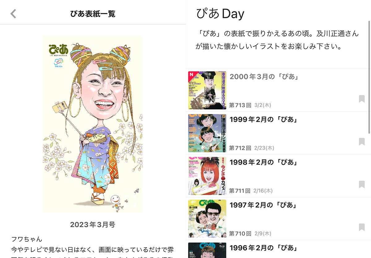 最新の表紙はアプリ起動時に表示されるとともに、アプリ内の「今日のぴあ表紙」コーナーから確認できます。情報誌「ぴあ」の時代から数えて作品数は1,300を超える中で、フワちゃんの登場は初となります。