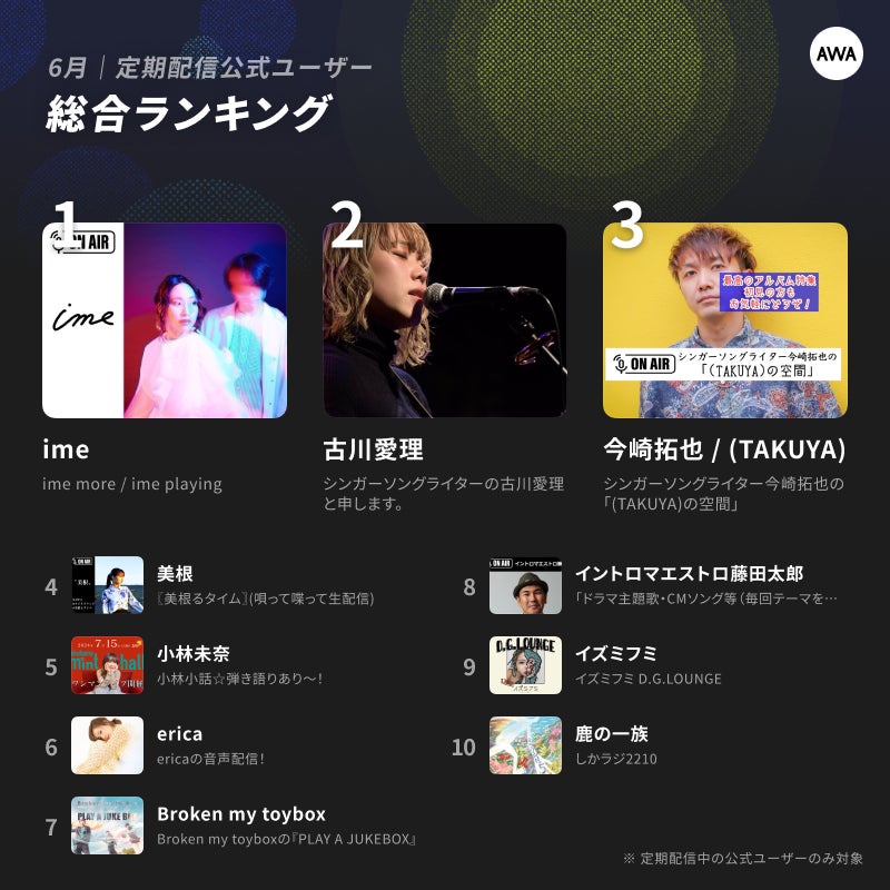 2024年6月度の定期配信AWAラウンジランキングで1位に輝いたのは、先月に引き続き、歌唱、ギター演奏、雑談などの幅広い配信内容で開催しているmikerrとTOSHIKI NAGASAWAの2人によるプロジェクト「ime」。2位には、シンガーソングライターの「古川愛理」。3位に、シンガーソングライターの「今崎拓也」がランクインしました。その他、〝美根〟、小林未奈、erica、Broken my toybox、鹿の一族が5月に引き続きランクインしました。