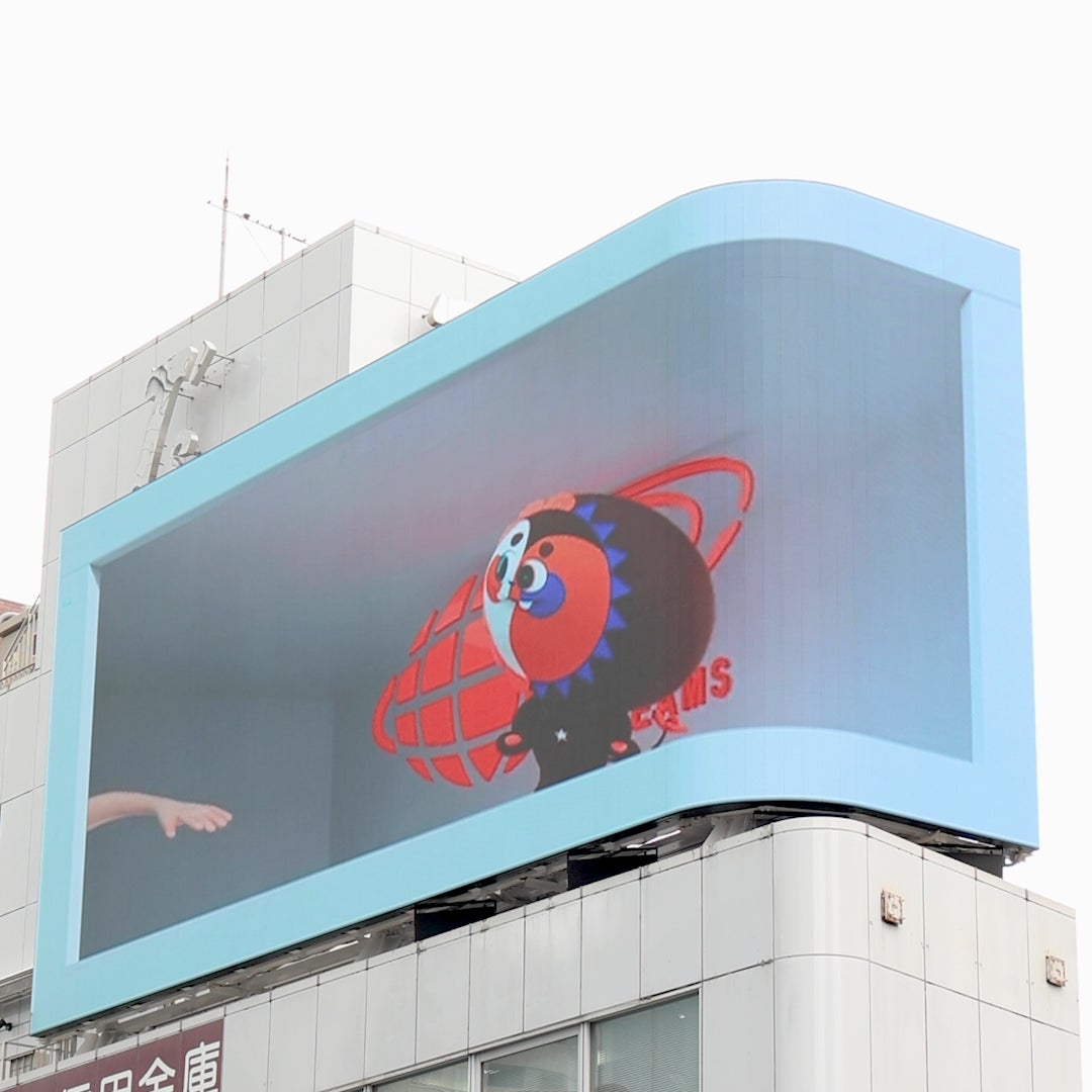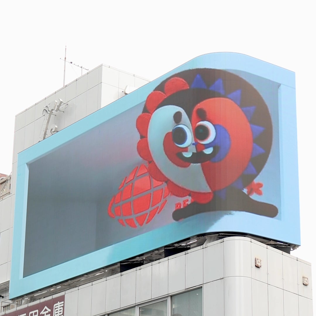 今回、LAVION(ラビオン)が初登場するのは、ビームス創業の地からほど近い、原宿の竹下通りと明治通りの交差点角地のビルの屋上に位置する大型屋外LEDビジョンです。最先端技術を駆使した3D映像で、ビームスが掲げる企業理念“Happy Life Solution Company”を体現する愛らしい動作を30秒間で表現しています。