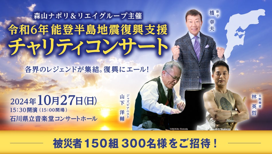 株式会社森山ナポリ(石川県金沢市、以下森山ナポリ)と親会社であるリエイグループは、1月に発生した令和6年能登半島地震の復興支援の一環として、2024年10月27日(日)石川県立音楽堂コンサートホールにて「復興支援チャリティコンサート」を企画・運営し、関係各所のご理解ご協力と、賛同を得た芸能各界のレジェンドが集結し開催いたします。 復興支援への想いをひとつに多くの皆様からの協賛も募っております。