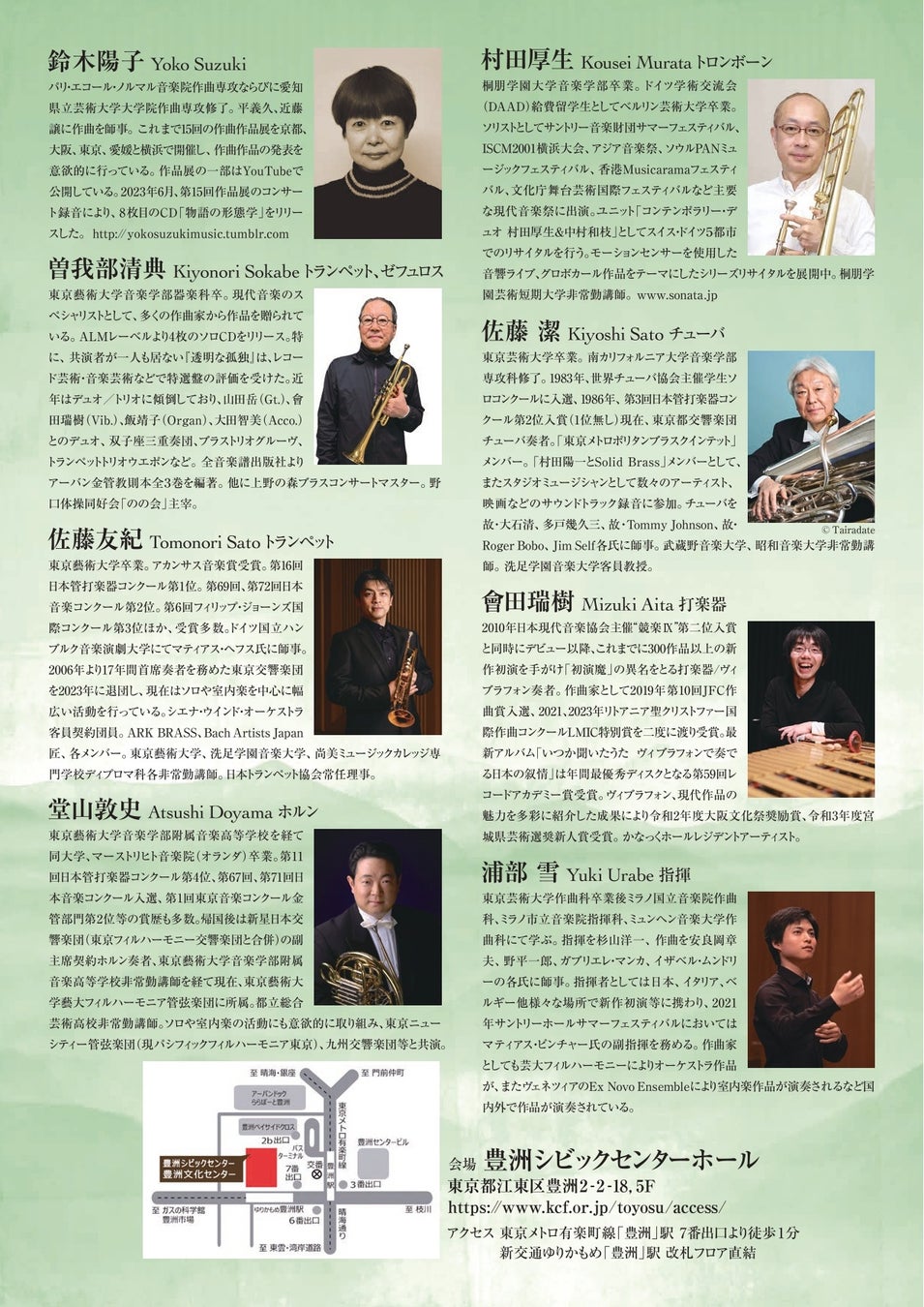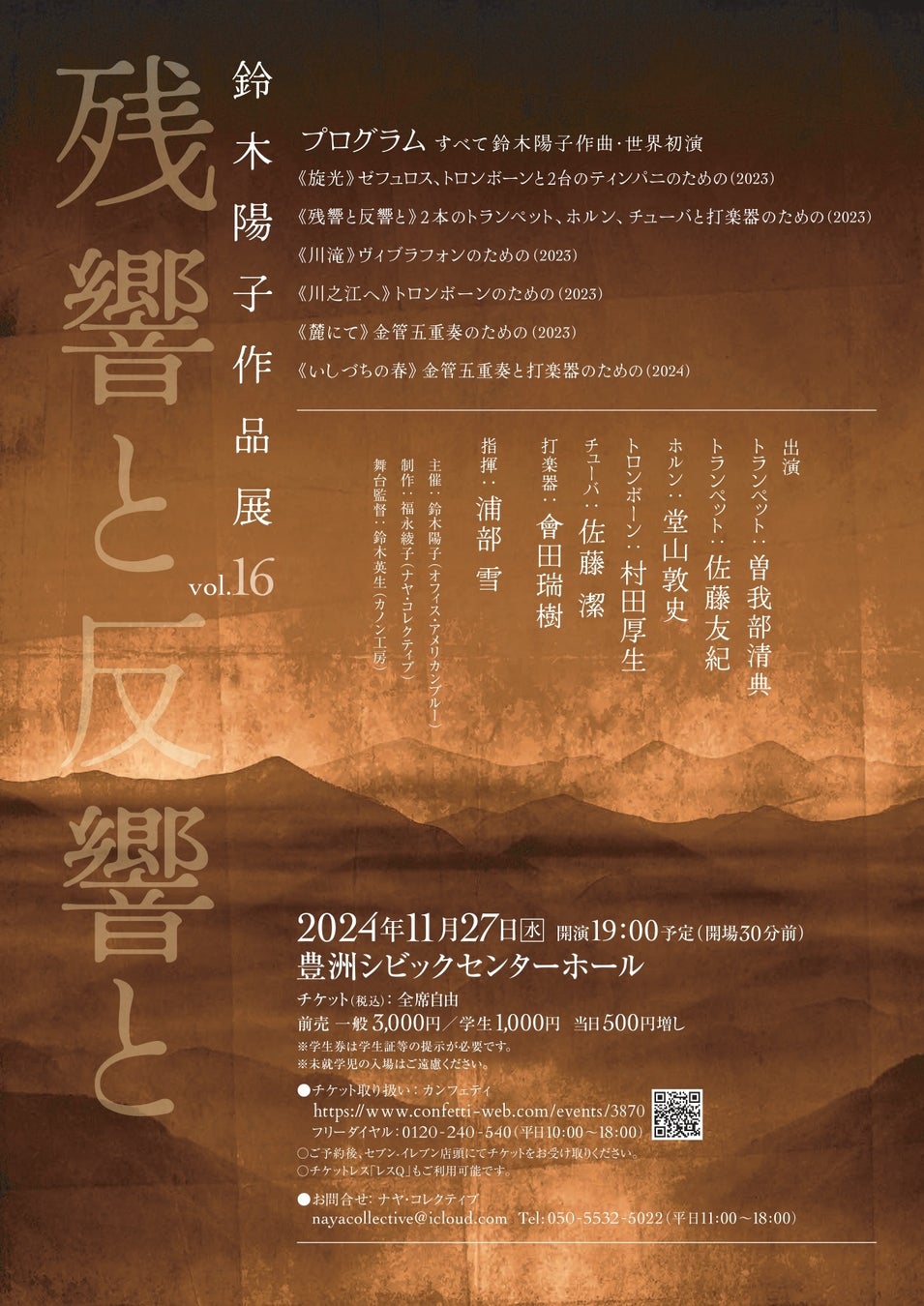 作曲家・鈴木陽子による16回目の作品個展。毎回、ユニークな視点やテーマのもとに全曲新作によるプログラムを実現。今回は、実力派の演奏陣を得て、作曲家にゆかりの深い愛媛の自然をテーマに書き上げた6曲をお届けする。