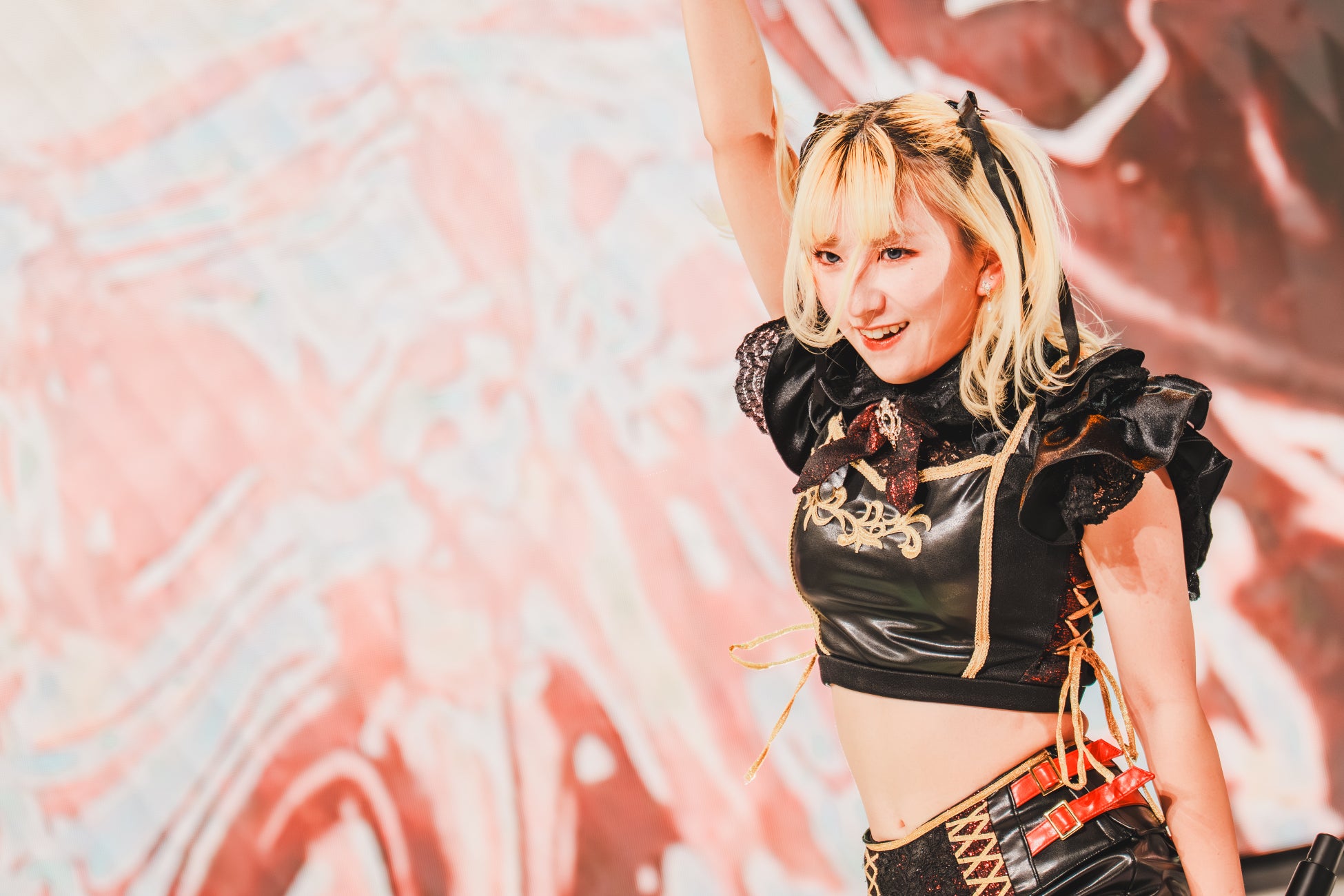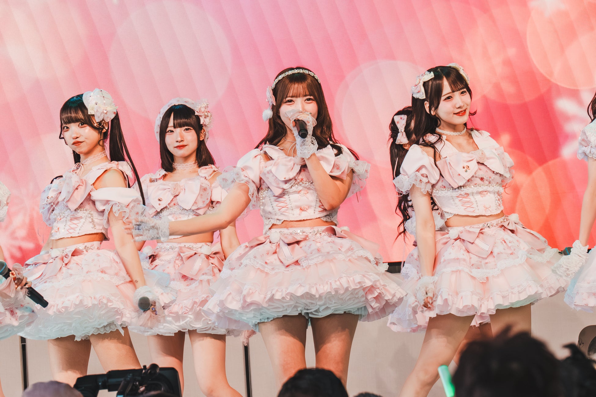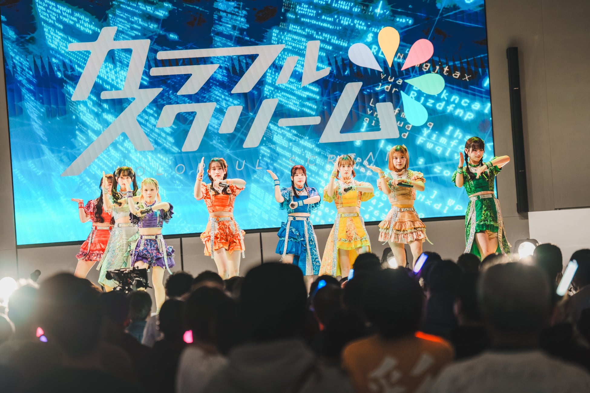イベントの大トリを飾ったのは、2025年6月にメジャーデビューを果たしたカラフルスクリーム。メンバーが「ラストは私たち、カラフルスクリームと楽しんでいきましょう」と呼びかけると、色とりどりのサイリウムが会場内に広がった。隊列を軸に、枝分かれをして新たな列を組むなどフォーメーションチェンジを次々繰り広げていく「クロネッカーの青春の彩り」で目を釘付けにすると、頭上で腕を大きく振るダイナミックな振付がエキサイティングな「Innocent Scream」など5曲を一気に畳み掛けた。顔に大粒の汗が伝うエネルギッシュなパフォーマンスを展開したメンバーは、「初めてテレビ大阪に来たよね。めっちゃきれい。トリを任せていただいて嬉しかったです」と初開催の“はばフェス”で大役を務めた喜びを噛み締めた。