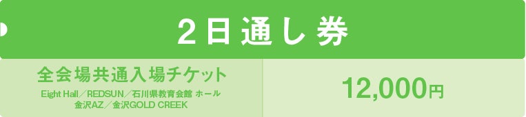 全会場共通入場チケット(Eight Hall / REDSUN / 石川県教育会館 ホール / 金沢AZ / 金沢GOLD CREEK)各1日券とお得な2日通し券の販売となります。